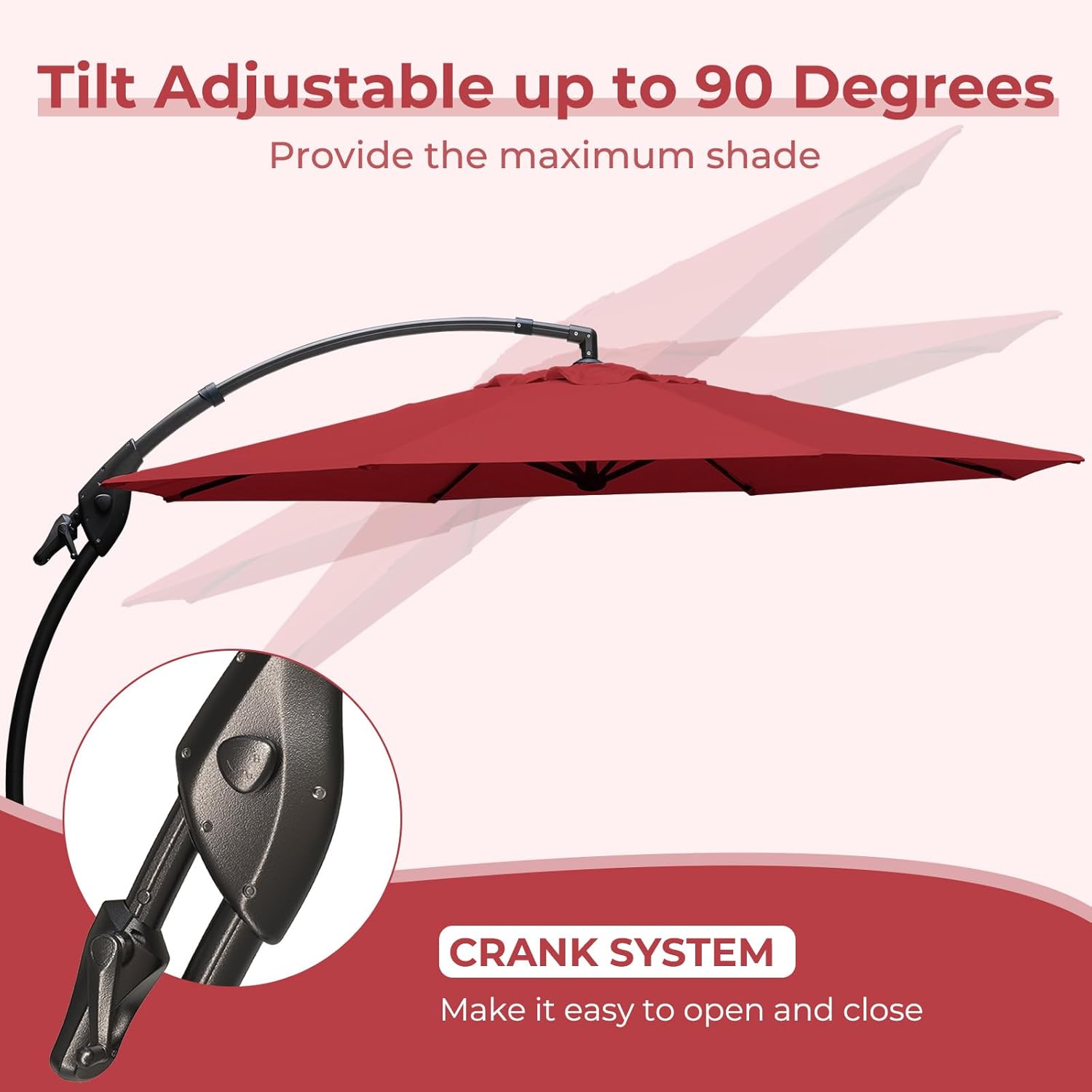 - ELEGANT CURVED POLE DESIGN: This large outdoor umbrellas with unique design opens and closes with an crank. The heavy-duty polyester canopy is made to stand up for seasons against water and UV rays. The reinforced pole is powder-coated aluminum for enhanced rust resistance
