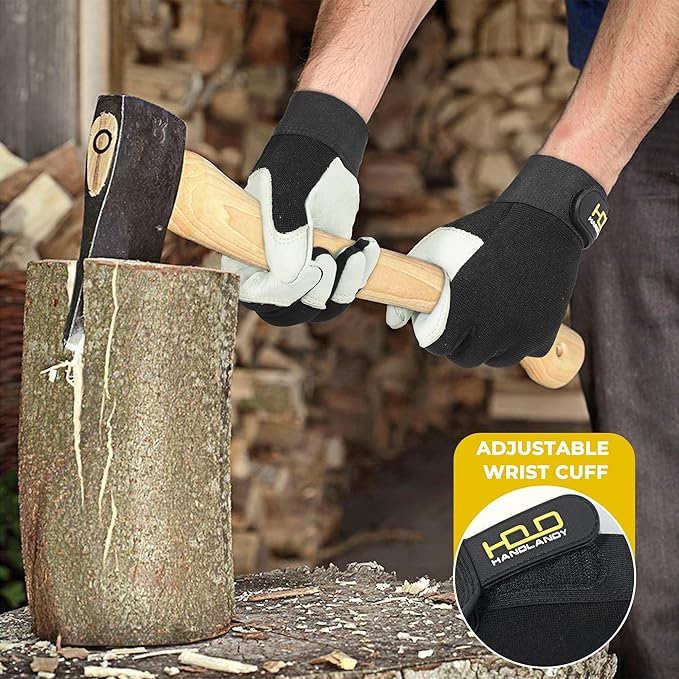 HLDD HANDLANDY Leather Work Gloves for Men & Women, Adjustable Wrist Cowhide Gardening Glove with Reinforced Palm for Driver