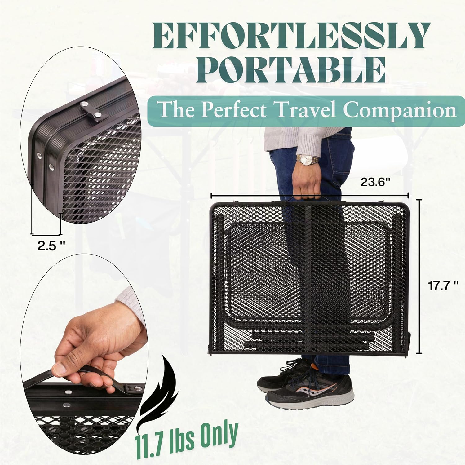 - ✅ Extra Storage Features: A Protective Cover Carry Bag, 2 wing panels, a Unique paper towel holder, a garbage holder, a mesh net with side pockets and utensil hooks for ample, organised storage. Its adjustable table design efficiently clears space and reduces clutter.