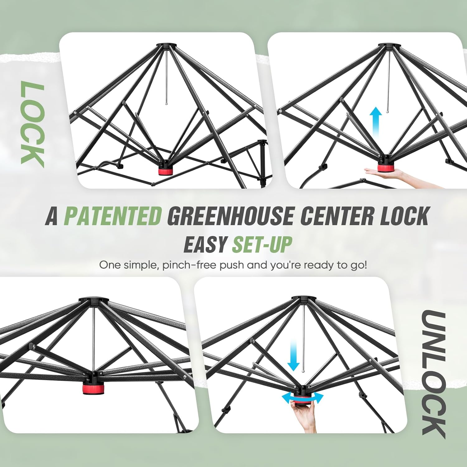 - EASY SETUP: This easy setup pop up greenhouse plant tent features the Peak Push system, a patented greenhouse center lock. The portable greenhouse requires no tools and easily opens and closes from the center in seconds. Its unique greenhouse center lock enables a quick, one person setup, letting you maximize gardening with minimal effort