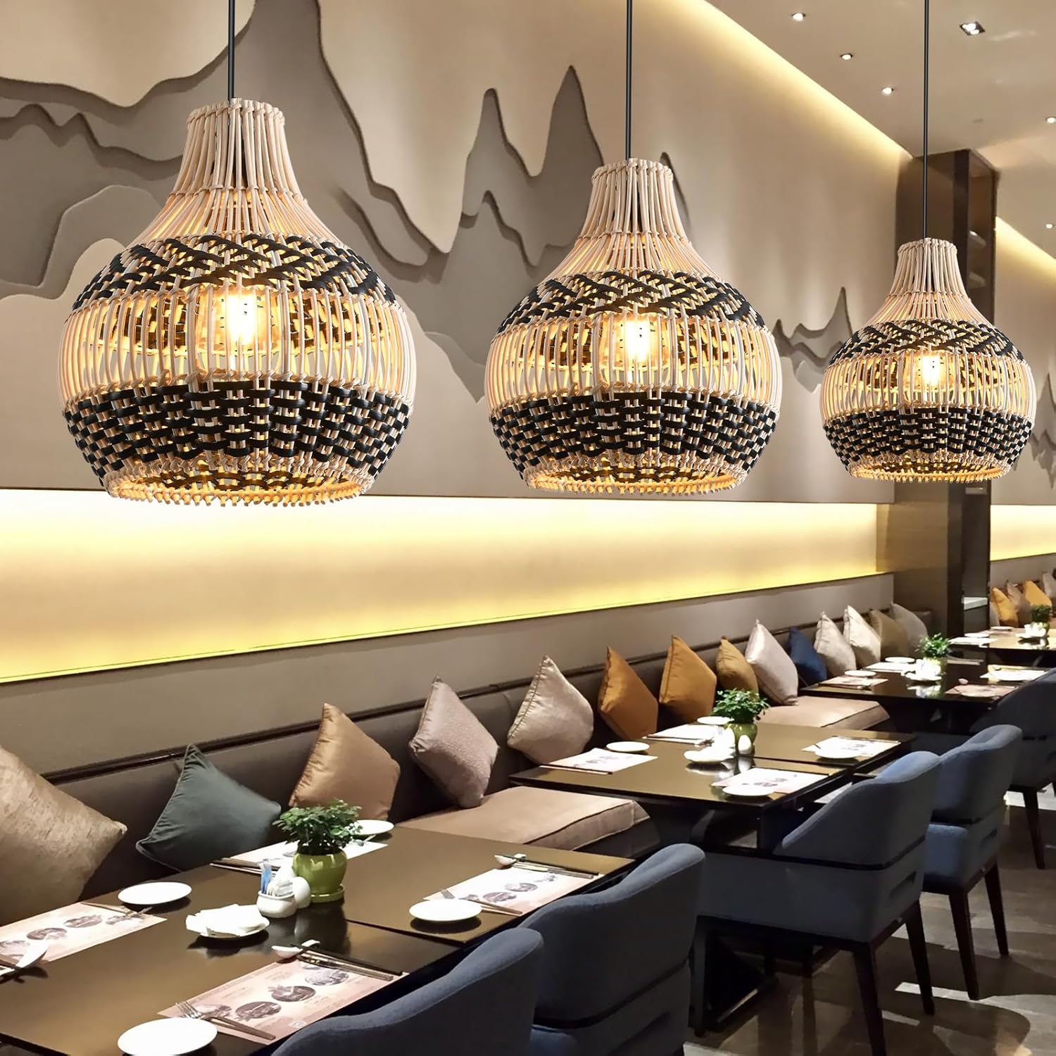 - 【Faux Rattan Pendant Light Excellent Design】Black white faux rattan+natural rattan craft, the pendants are made of natural rattan and faux rattan materials. The lights are hand woven with by rattan craft superb skills rattan artists. Decorated with classic tropical style elements, creates a wonderfully new look