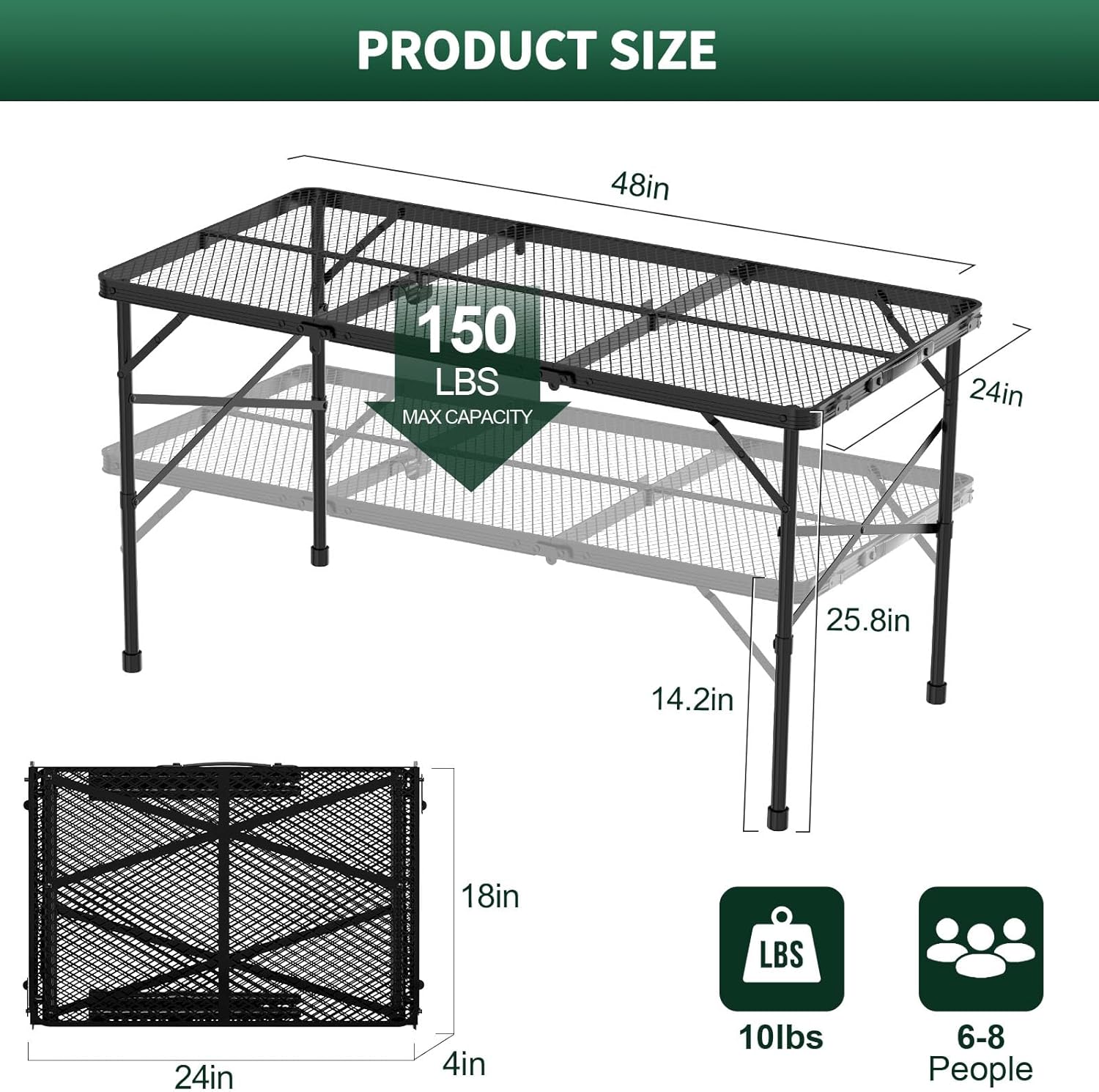 Folding Gril Table, 4x2 FT Camping Table with Mesh Desktop,Height Adjustable Folding Grill Table with Mesh Bag,Portable Outdoor for Picnic,Camping,BBQ,Beach(Black)