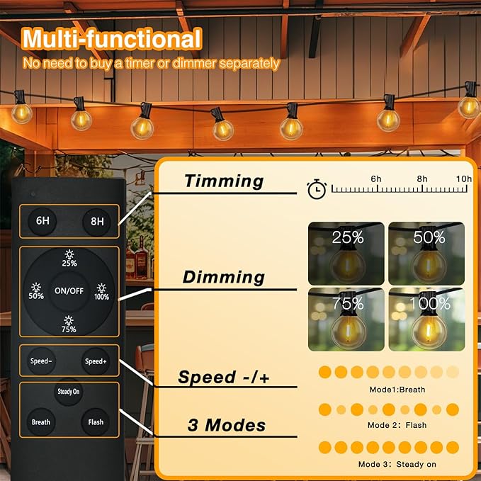 - Multifunctional Remote Control: Adjust the brightness levels (25%, 50%, 75%, 100%), set timers for 6, 8, or 10 hours, and 3 Brightness Mode: Soft/Bright/Super Bright. One remote, endless charm—no extra timers and dimmer required.