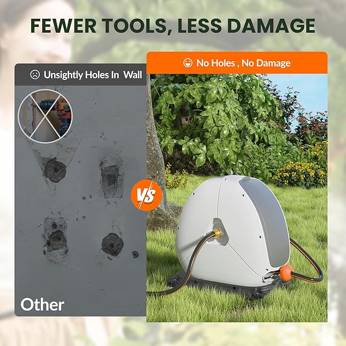 - LESS TOOLS, LESS FUSS – No wall damage or complicated installations needed! Easily install our reel on lawn using only a hammer (concrete installation option also available), while compact and sleek design complement any outdoor décor.