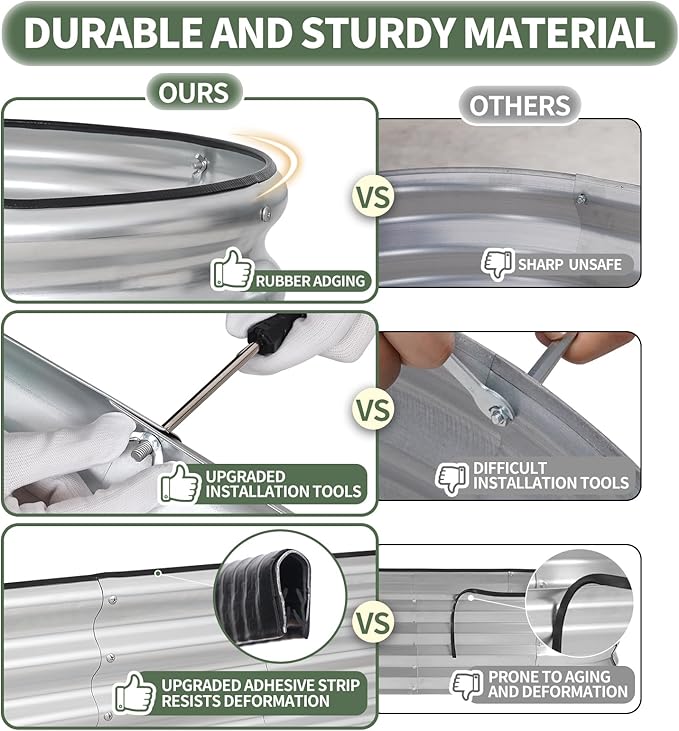 - 【Safety Edge Design & Durable Rubber Strips】The garden bed's top and bottom edges are folded to eliminate sharp edges, ensuring safety from all sides. Rubber strips add extra protection and cushioning, with built-in patches for durability. The galvanized planting box offers the perfect solution for creating your ideal vegetable garden. With the 1More raised bed, enjoy a worry-free gardening experience, prioritizing your safety and convenience. The ultimate choice for a hassle-free and enjoyable gardening experience.