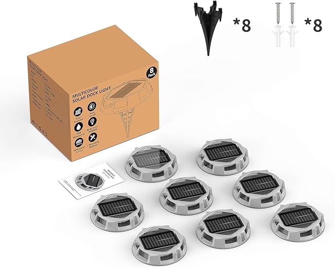 - 【12 Lighting Modes】We have upgraded these solar dock lights from the previous single-color mode to 9 fixed color modes and 3 dynamic light modes. It can be used as a warning step lights, LED driveway markers to prevent accidents, or as an atmosphere light decoration, which greatly broadens the use scenarios.