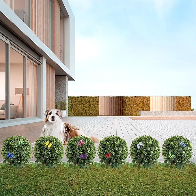 - 【90-Second Setup & Versatile Styling】 Pre-assembled structure with bendable vines and embedded ground spike allows instant installation in soil, pots, or rocky terrain. Rotate 360° to showcase fake butterfly ornaments from every angle – Our evergreen faux boxwood balls is perfect for photo-ready porch décor or events
