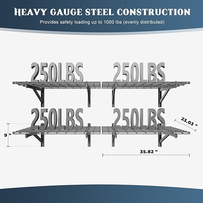 - 🏆【Heavy-Duty Load Capacity】- Jusgym garage shelving wall mounted system is engineered with premium steel, offering exceptional strength. Each 2x3ft bracket holds up to 250 lbs, and with 4 shelves totaling 1000lbs capacity, it effortlessly stores bulky items like tools, tires, and heavy storage bins. Built to last, even under extreme weight!