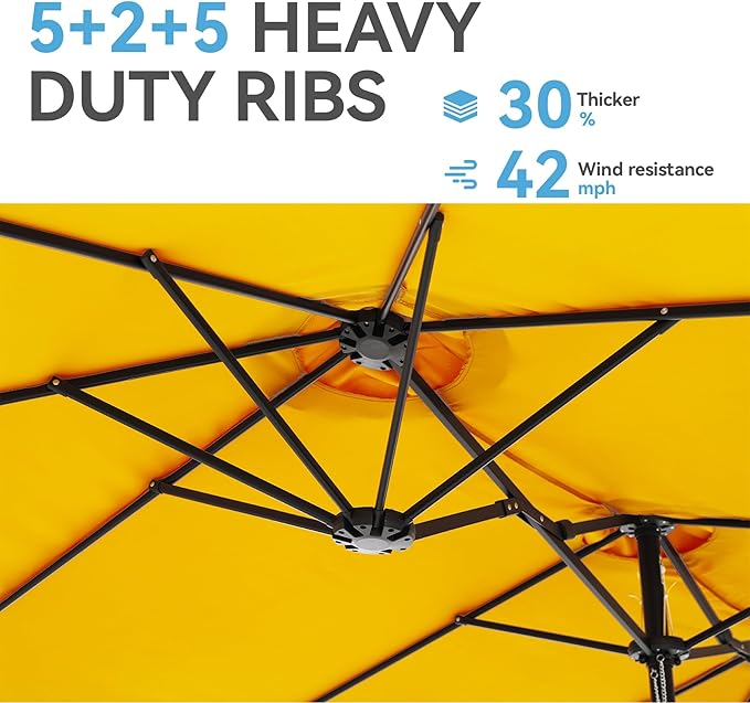 - EXTRA-LARGE SHADING AREA: This double umbrella outdoor patio can be used with 4-6 person patio dining set or outdoor furniture set. Ideal for family gatherings, outdoor dining or relaxing, it can provide ample shade area for your family and friends.