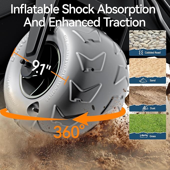 - All-Terrain Mastery | Sand/Grass/Gravel Ready: 10-inch extra-wide puncture-proof tires + dual ball bearings, effortlessly conquer sand, rocks, and mud (supports 300lbs, 20% more than competitors).