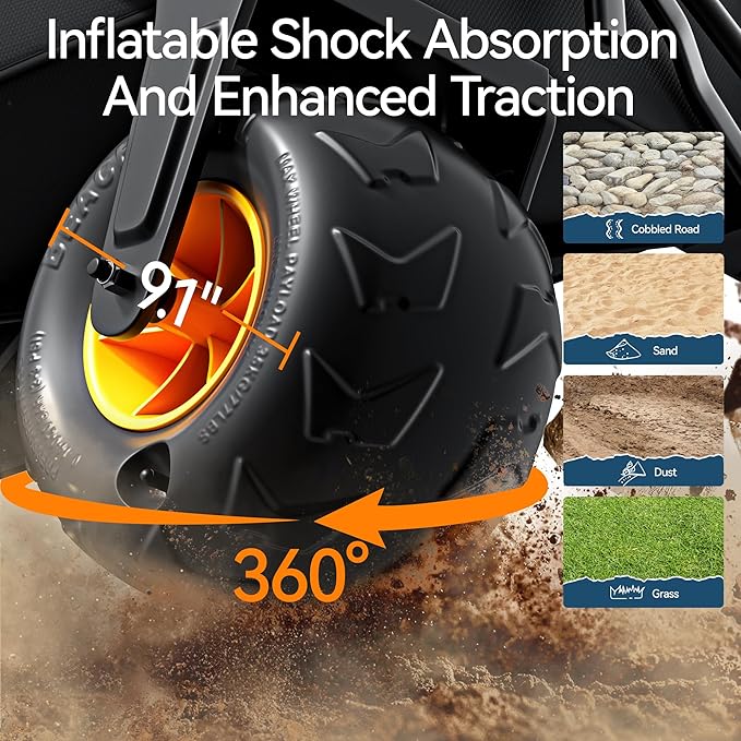 - All-Terrain Mastery | Sand/Grass/Gravel Ready: 10-inch extra-wide puncture-proof tires + dual ball bearings, effortlessly conquer sand, rocks, and mud (supports 300lbs, 20% more than competitors).
