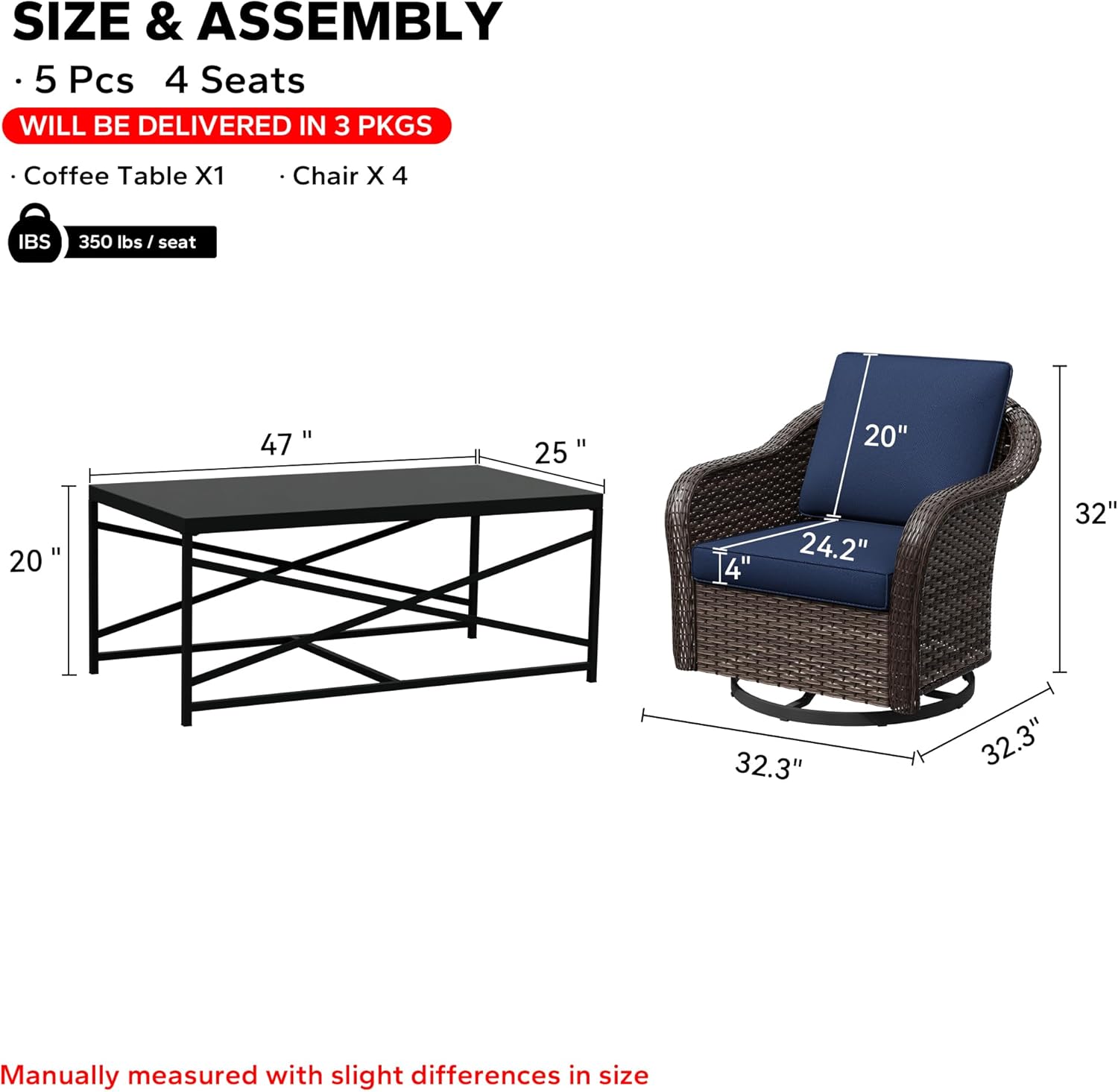 5 Pieces Outdoor Patio Conversation Furniture Set, 4 Pieces Rattan Glider 360 Degree Swivel Rocker Chairs with Removable Cushions, Coffee Table for Porch, Poolside (Navy Blue)