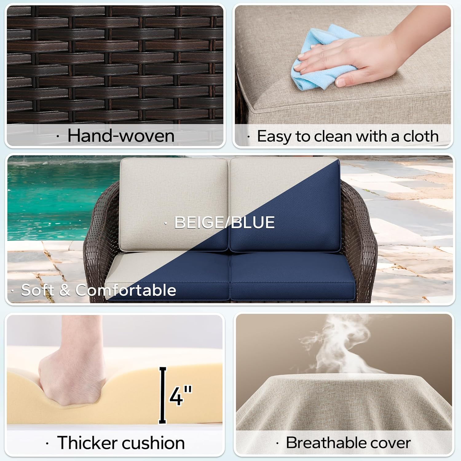 - Sturdy and Durable: The outdoor furniture set is made of steel frame and PE wicker, ensuring that it will be more sturdy. Fade-resistant fabrics of cushions is stain & fade resistance, tear & wear resistance