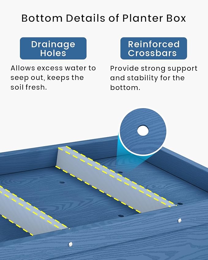 - Drainage System: This planter box is equipped with drainage holes at the bottom to allow excess water to drain out, keeping the soil fresh. Two reinforcing crossbars provide added support, preventing the bottom from detaching.