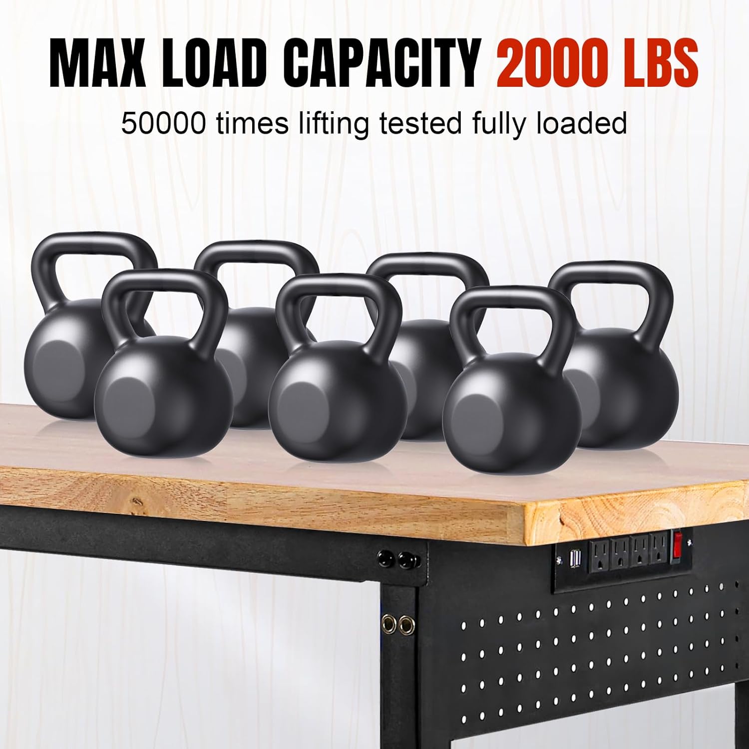 - SOLID RUBBER WOOD AND THICK STEEL: The tabletop is made of 66“ x 22” x 1.2” solid rubber wood. It is finely coated and polished for long life and easy cleaning. The steel is 1.3mm thick.Precision cutting process makes this workbench with 2000LBS weight capacity, ideal for auto repair projects and gardening.