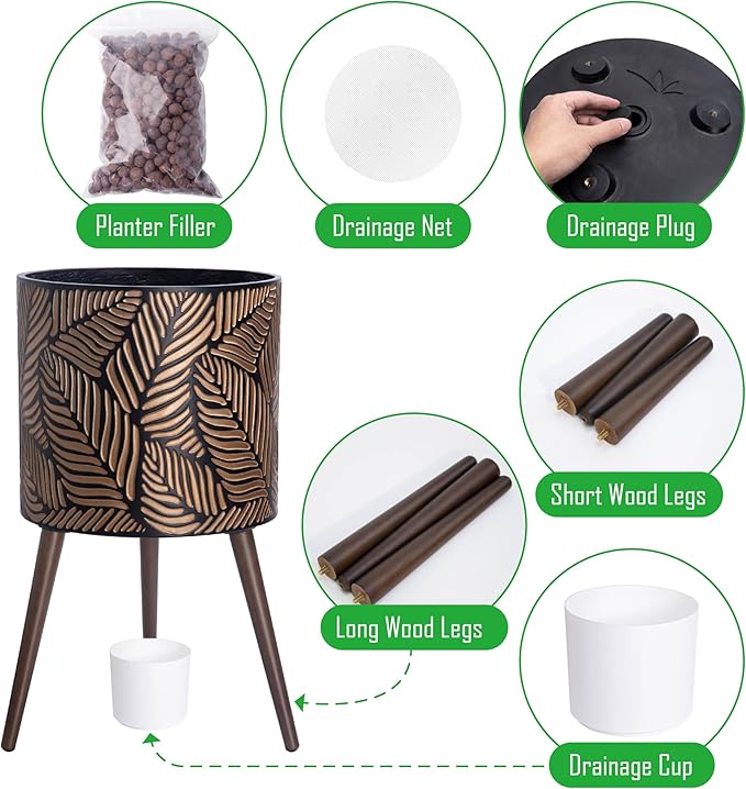 - What’s included: planter pot with drainage hole, drainage plug, set of 2 stand (3 long wooden legs & 3 short wooden legs).