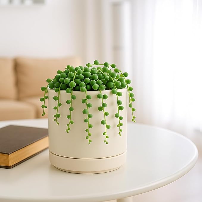 - Simple, elegant, and modern cylindrical straight round planter pot with saucer and drainage hole.