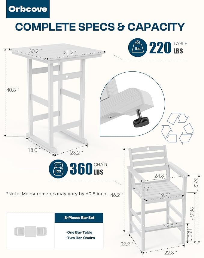 - Durable All-Weather Design: (Please note!!!Your order consists of two or three separate packages, which may be delivered at different times.) Crafted from HDPE with a natural wood grain finish, Orbcove bar table and chairs set withstands sun, rain, and wind without fading or cracking. Ideal for deck furniture, backyard furniture, or porch furniture, it’s perfect for year-round outdoor living.