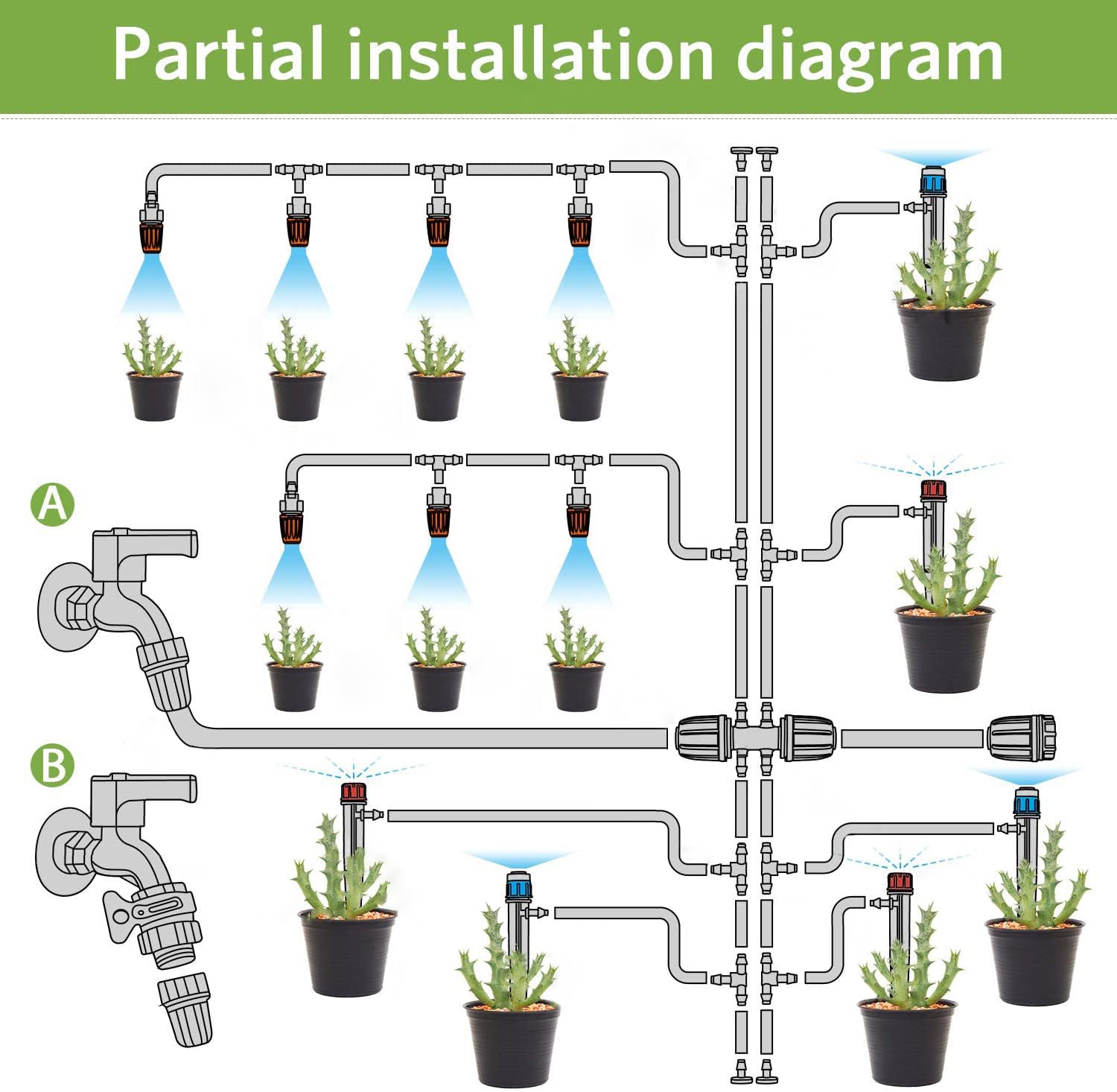 - 【What will you get】:My drip irrigation kit includes 26FT 1/2 Irrigation Hose ,200FT 1/4 Distribution Tubing ,Fountai Nozzle*10,Drip Emitters Sprayer*10,Nozzles*20,1/2inch to 1/4inch Barbed tee*4 ,Nozzle Tees*20,Dripper Tess,*25,Main Line end Closure*1,End Couplings*10,Faucet Connector*10,4/6 Faucet Connector*1 ,Teflon Tape*1.