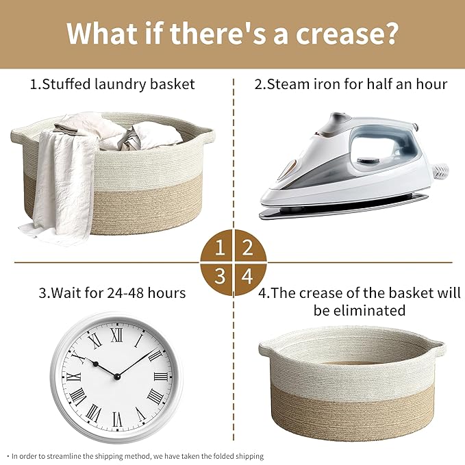 - Note: Blankets basket comes folded and may have creases. Fully fill the rope basket with towels or clothes and wait for 1-2 days will help reshape the blanket basket. Alternatively, use steam or ironing for a quick reshape the laundry basket
