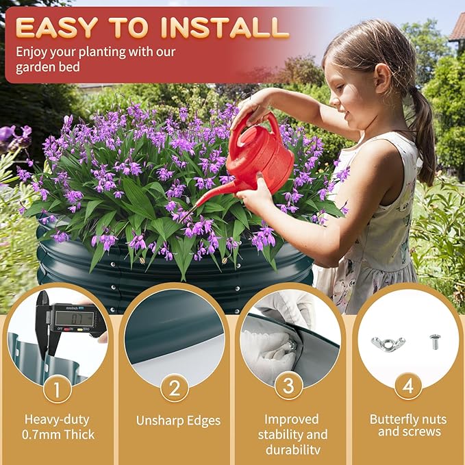 - 【DURABLE & STABLE】: ZBZBML round raised garden bed (2.7×2.7×1ft) is 32 IN Diameter,11.8IN Tall, each is made of 0.8MM thick Q195 galvanized metal sheet painted, double-layer anti-corrosion galvanizing and round structure design,it is built to providing a solid foundation for your plants.