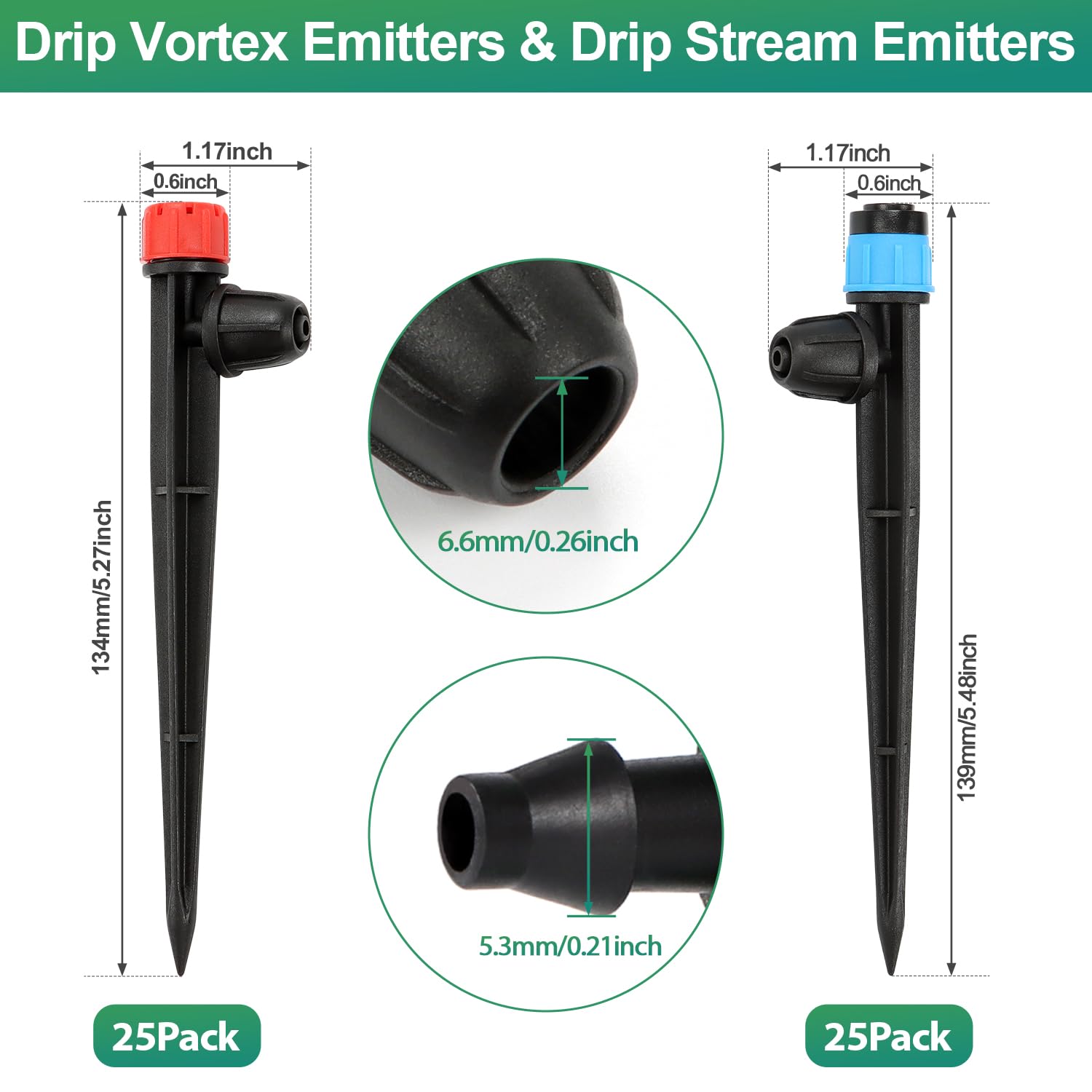 50 Pieces Drip Emitters for 1/4" Drip Irrigation Tubing, 25 Pcs Vortex Emitters and 25 Pcs Stream Emitters Adjustable 360 Degree Full Circle Drip Emitters with Stake