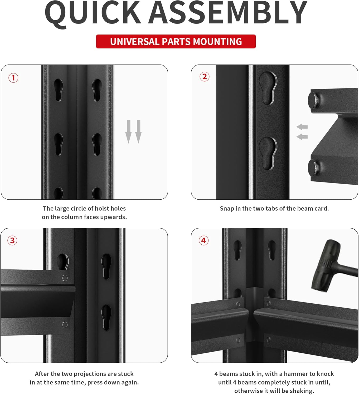 - 🦴【Adjustable Four-Tier Shelving】The garage shelving comes with adjustable four-tier shelves, allowing you to customize the height of each shelf to accommodate items of various sizes. This flexibility makes it ideal for organizing everything from small tools to large boxes.
