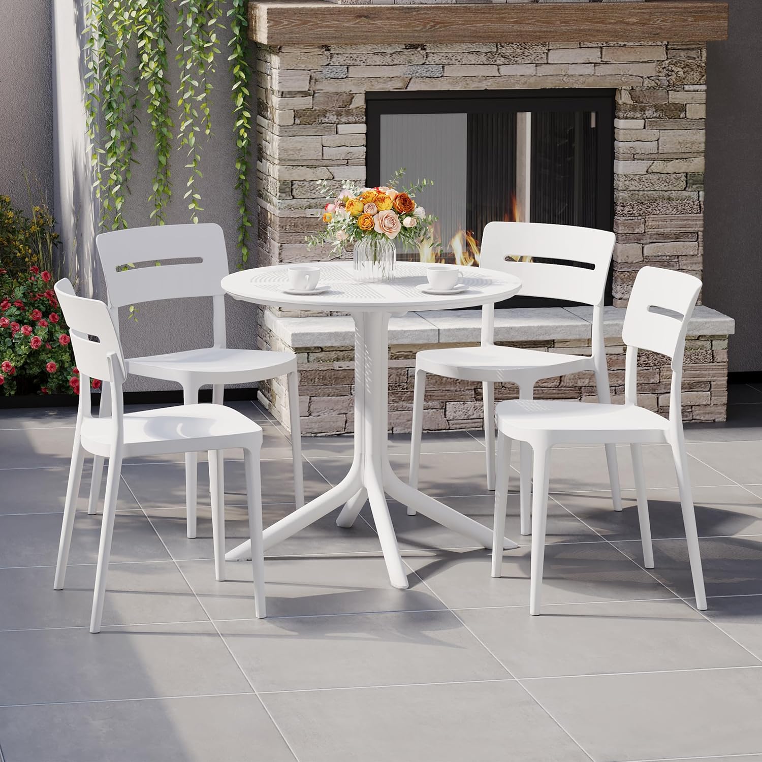 Dining Set for 4, HDPE Patio Round Dining Table and Stackable Comfortable Dining Chair, Outdoor Small Patio Furniture Set All Weather for Backyard Porch Poolside, White
