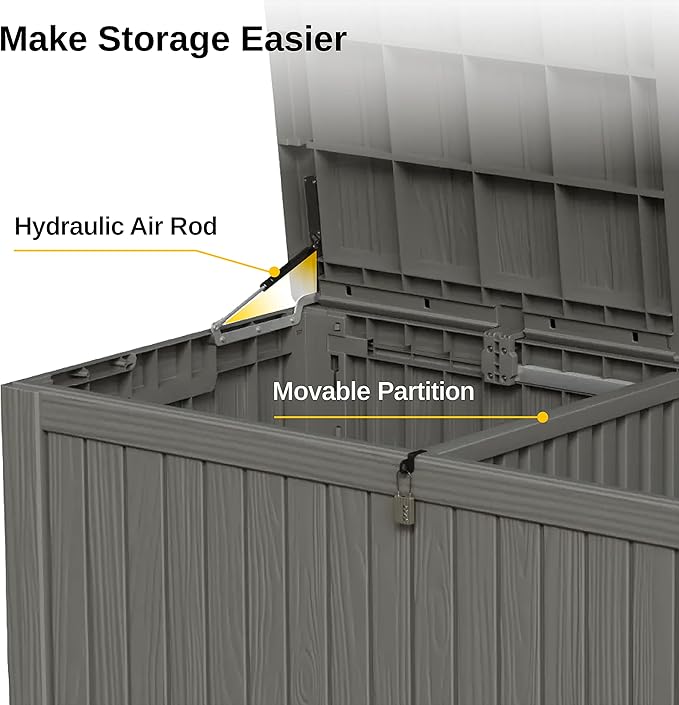 - 𝗦𝗔𝗙𝗘 𝗔𝗡𝗗 𝗨𝗦𝗘𝗥-𝗙𝗥𝗜𝗘𝗡𝗗𝗟𝗬 𝗗𝗘𝗦𝗜𝗚𝗡: Featuring a hydraulic lever mechanism, this outdoor storage box ensures smooth and safe operation, eliminating the risk of hand injuries. Inside, a detachable partition allows for organized, sectioned storage of your items.