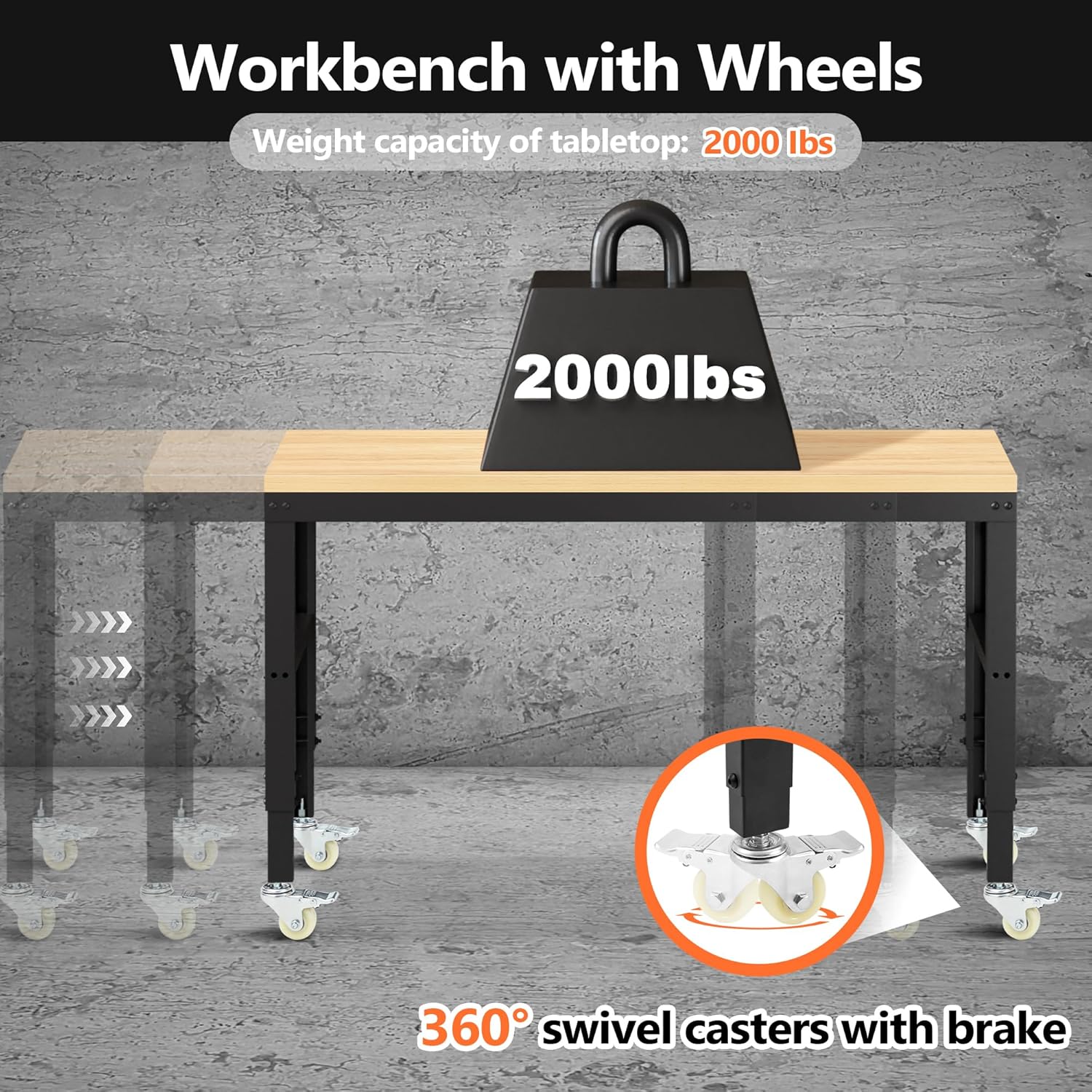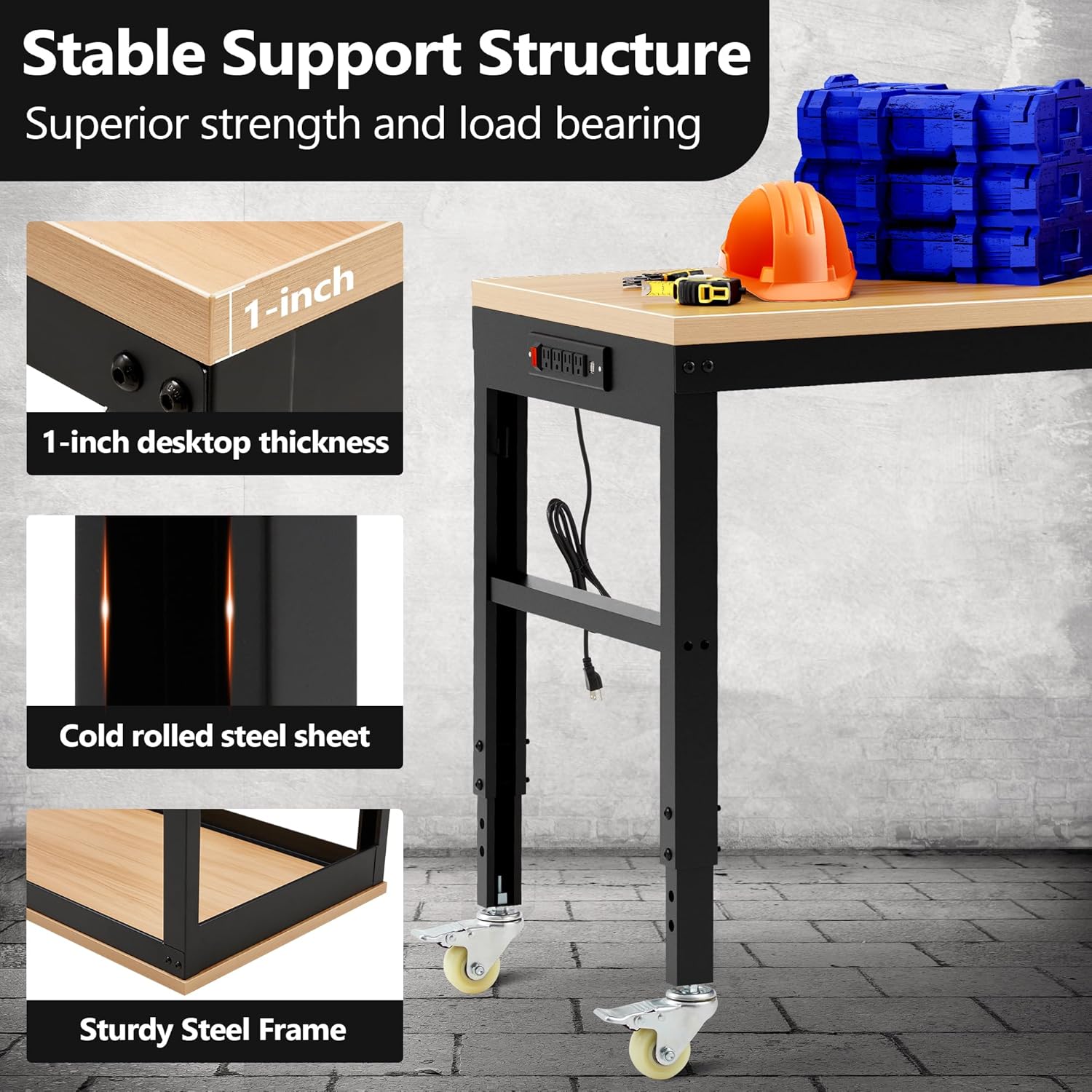 - Heavy Duty Work Bench: Constructed of high quality materials, the workbench consists of a 1" thick wood board tabletop and black textured steel frame that withstands powerful impacts up to 2000 lbs