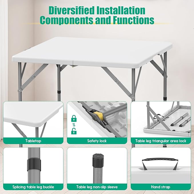 - High-Quality & Sturdy: Constructed with premium HDPE material and reinforced steel legs, our square folding table can hold up to 330 pounds, ensuring long-lasting stability and durability
