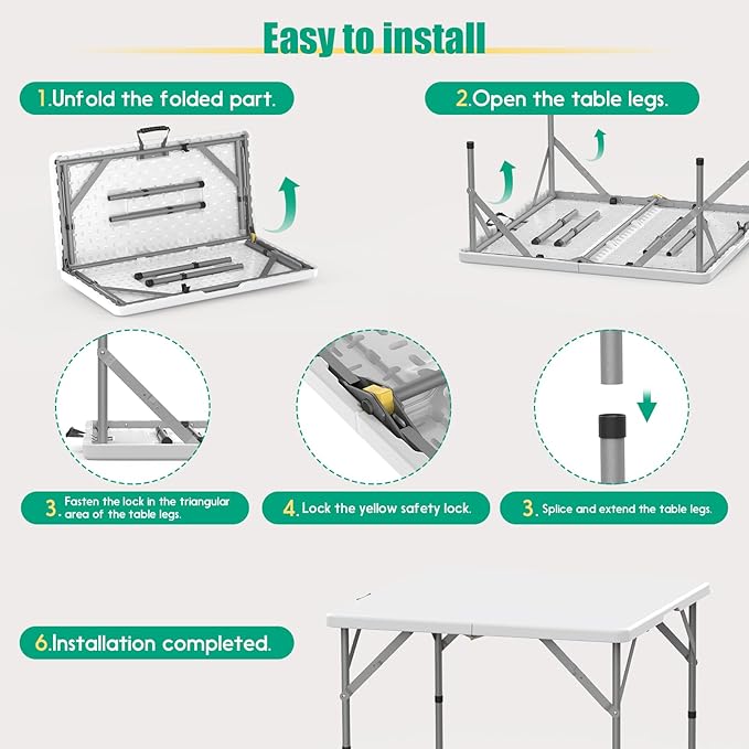 - Safe & Secure Design: Equipped with a safety lock on the back of the table top and four legs add non-slip mats, this foldable table provides added safety and security during use