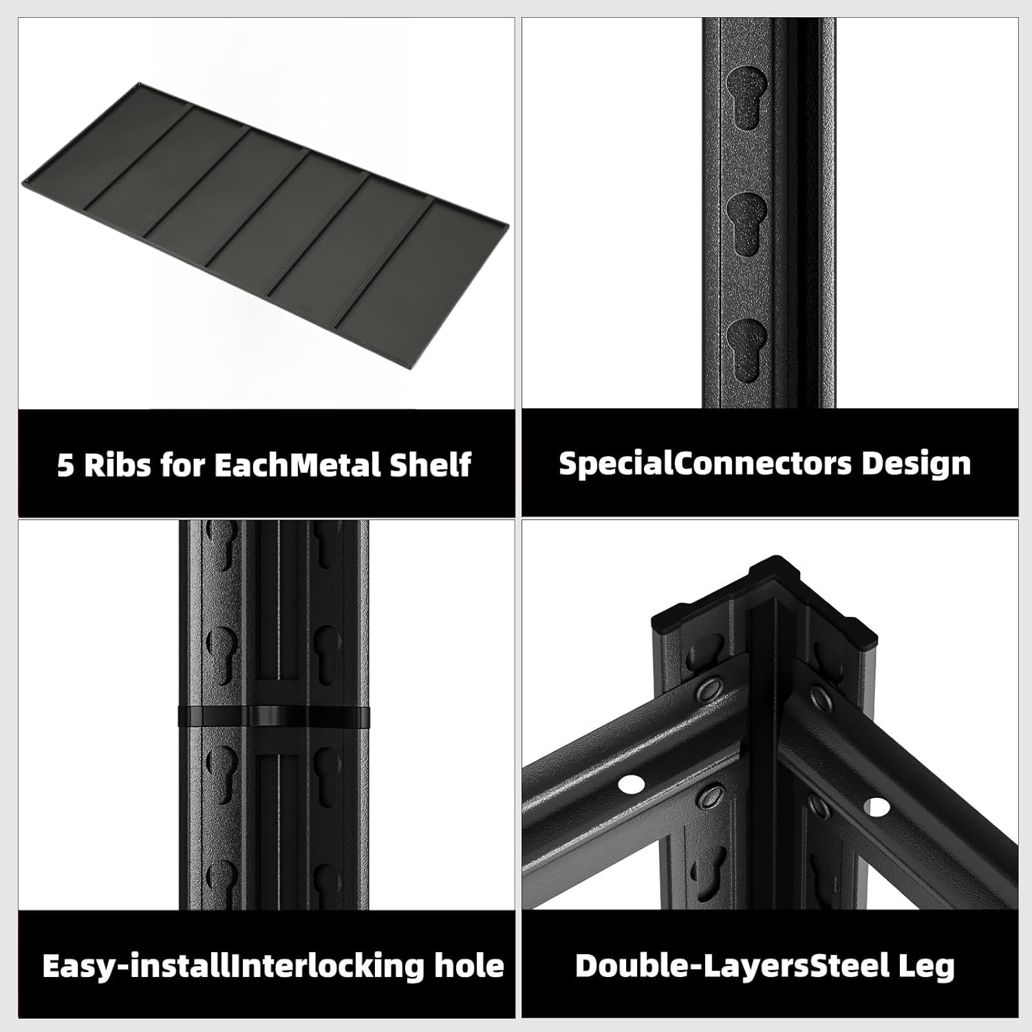 - 6 Tier Metal Shelf Unit: The garage shelves are constructed with reinforced, double-layered uprights that deliver exceptional load-bearing capacity, ensuring long-term use and stability. Each shelf incorporates 5 reinforcing rods and 1 support ribs at the back, enhancing stability and ensuring even weight distribution for the safe storage of heavy items.