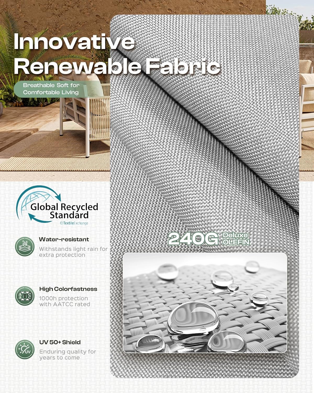 - 【Durable Design】 This modern outdoor furniture features a high-strength aluminum frame that is far stronger and more durable than typical metal frame. The powder-coated surface enhances weather resistance. The Olefin fabric combines durability with UV protection for years of outdoor enjoyment. The HDPE handcrafted rope has exceptionally high strength, offering wear resistance and a longer lifespan compared to traditional wicker, setting it apart from other wicker outdoor furniture.