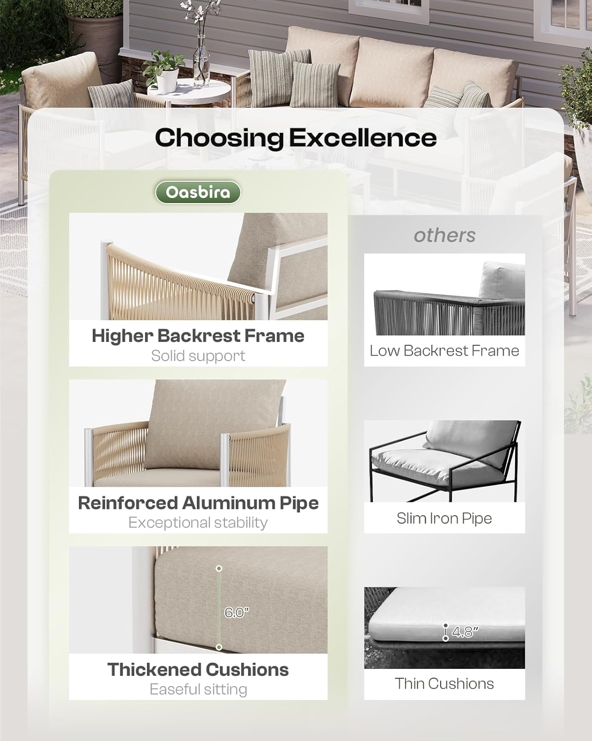 - 【Ultimate Comfort】 The cushions of the Oasbira patio furniture set are filled with honeycomb structure foam, offering exceptional comfort. This outdoor seating furniture features an elevated backrest frame reaching 29.4 inches, providing support that far beyond average patio sets. Each seat is 23.6 inches wide, offering ample space and ensuring ergonomic relaxation.