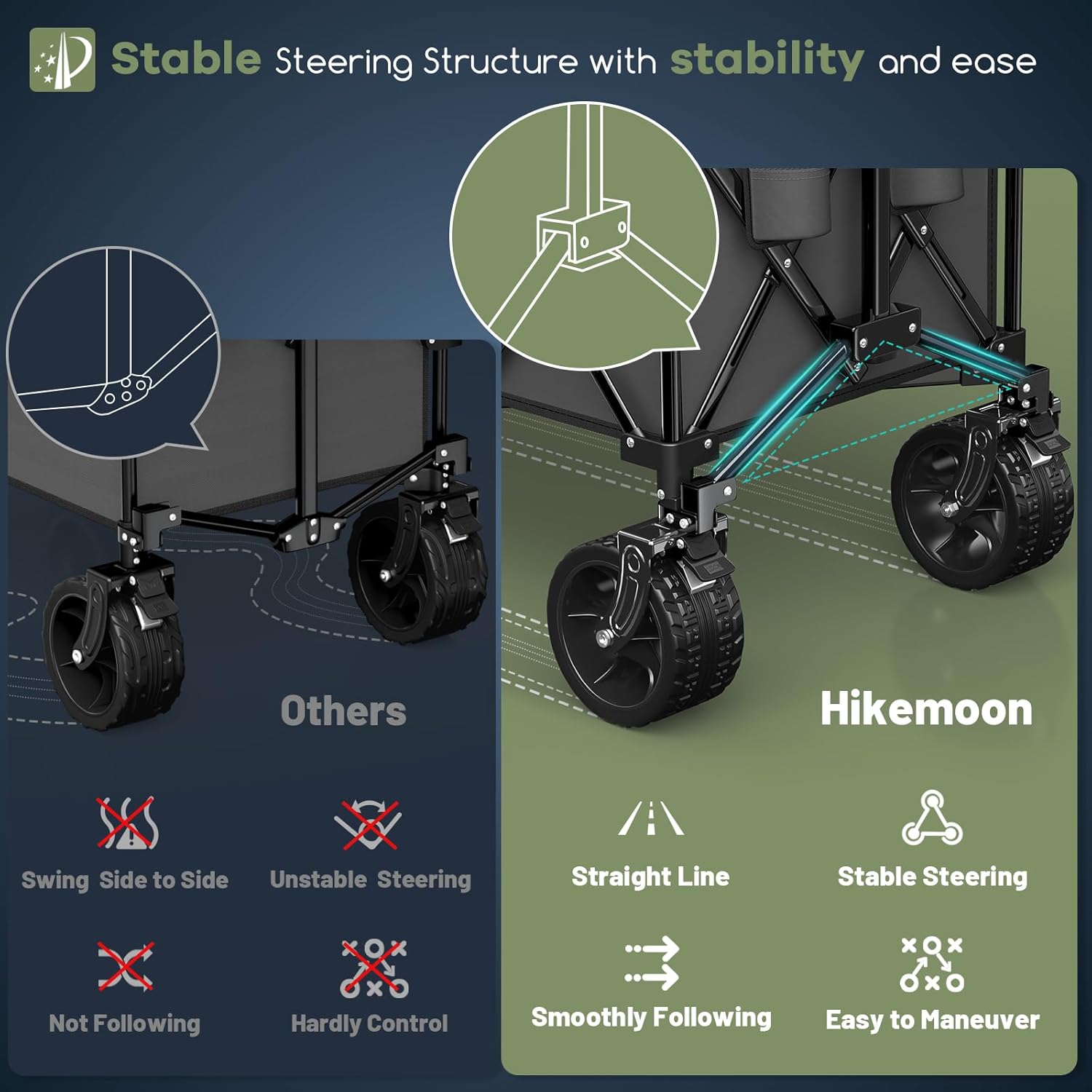 - 【𝐏𝐚𝐭𝐞𝐧𝐭𝐞𝐝 𝐒𝐭𝐚𝐛𝐥𝐞 𝐒𝐭𝐞𝐞𝐫𝐢𝐧𝐠 𝐒𝐭𝐫𝐮𝐜𝐭𝐮𝐫𝐞 & 𝐀𝐝𝐣𝐮𝐬𝐭𝐚𝐛𝐥𝐞 𝐇𝐚𝐧𝐝𝐥𝐞 𝐅𝐨𝐥𝐝𝐚𝐛𝐥𝐞 𝐖𝐚𝐠𝐨𝐧 𝐂𝐚𝐫𝐭𝐬】: The upgraded stable steering structure ensures the folding wagon moves in a straight line without swaying or wheel collision. The handle can be rotated 90° forward and backward, making it easier for people of different heights to use. The rebound function keeps the handle upright, so you don’t have to bend over to reach it. These designs make the wagon easy, stable, and maneuverable to pull and steer.