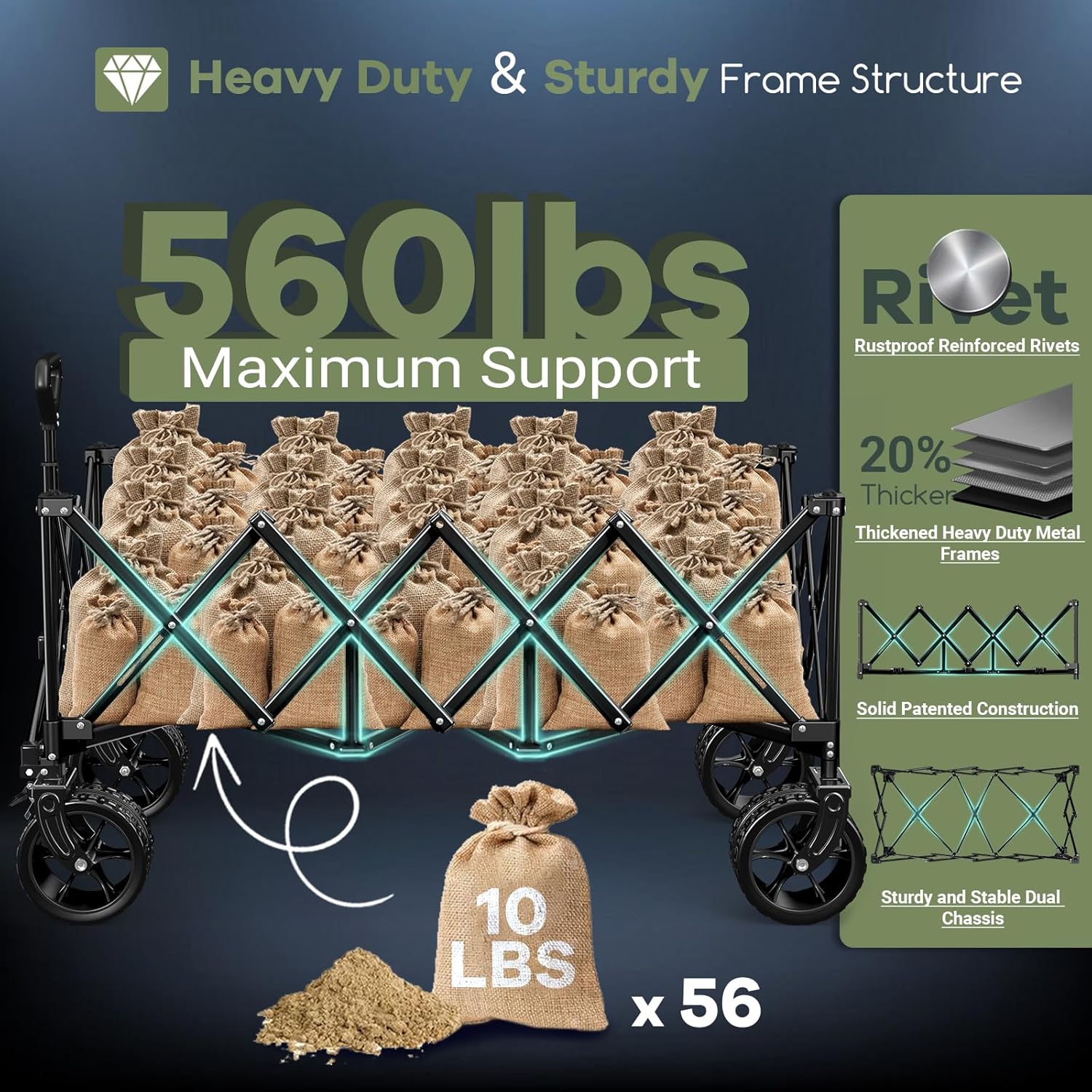 - 【𝟓𝟔𝟎𝐋𝐁 𝐋𝐚𝐫𝐠𝐞𝐫 𝐖𝐞𝐢𝐠𝐡𝐭 𝐂𝐚𝐩𝐚𝐜𝐢𝐭𝐲 𝐒𝐭𝐮𝐫𝐝𝐲 𝐇𝐞𝐚𝐯𝐲 𝐃𝐮𝐭𝐲 𝐌𝐞𝐭𝐚𝐥 𝐅𝐫𝐚𝐦𝐞 𝐅𝐨𝐥𝐝𝐢𝐧𝐠 𝐂𝐚𝐫𝐭】: The reinforced heavy-duty metal frames give this premium collapsible wagon a static weight capacity of up to 560 LB and a dynamic weight capacity of up to 440 LB, making it more robust and resistant to buckling or deformation. The foldable utility cart can easily transport camping gear, garden tools, beach chairs, and groceries. It features 600D Oxford fabric that is tear-resistant, long-lasting, waterproof, and easy to clean.