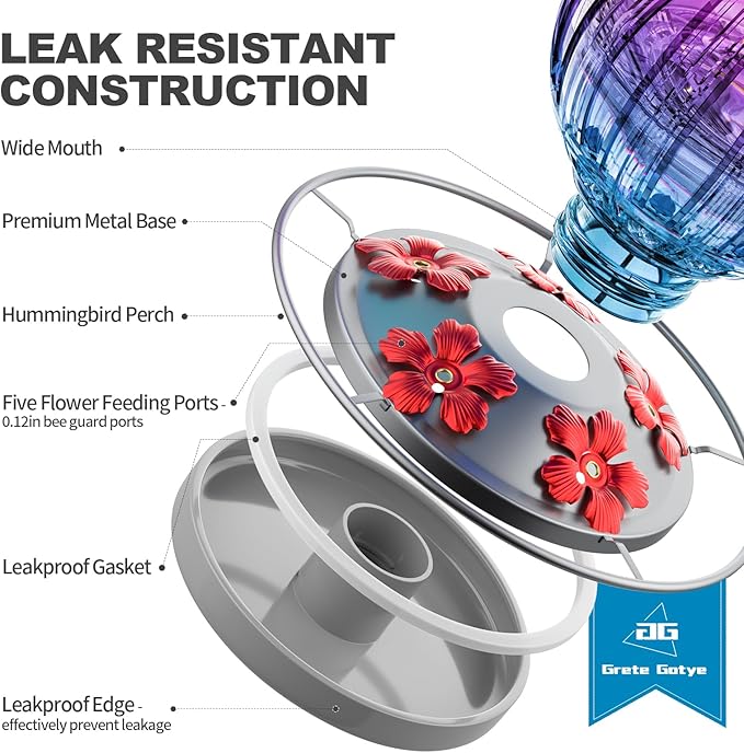 - 💧LEAKPROOF FUNCTION: Built-in durable gasket, unique design makes base connection proper and seamless, even when the hummingbird feeders for outdoors hanging are shaken by wind or birds perching on it. After filling the container and screwing it onto the base, flip it over and hang it on a tree/deck hook/shepherd's hook/hangers/window hook.