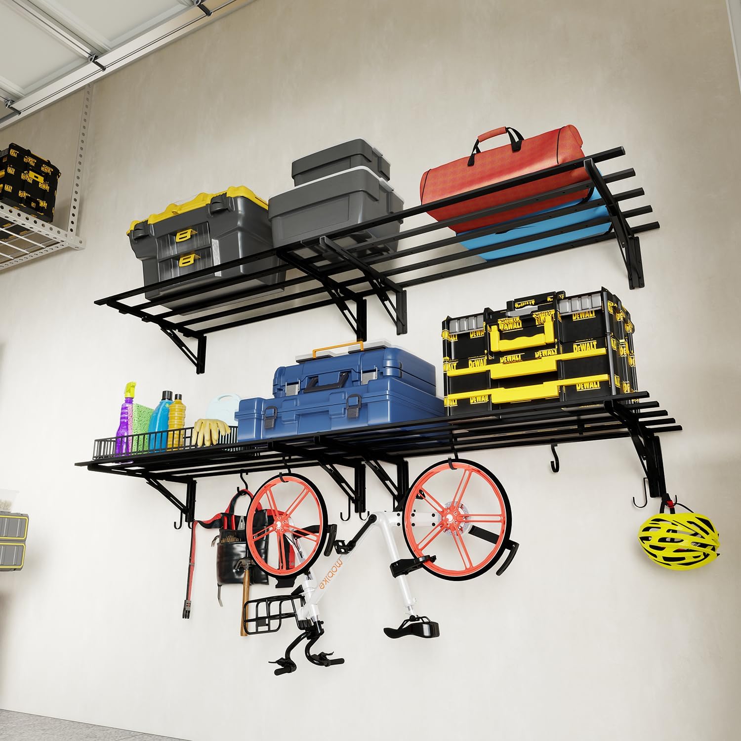 - 𝐅𝐥𝐞𝐱𝐢𝐛𝐥𝐞, 𝐂𝐮𝐬𝐭𝐨𝐦𝐢𝐳𝐚𝐛𝐥𝐞 𝐅𝐢𝐭: Adjustable hooks and modular brackets make perfect garage hanging shelves and garage wall rack systems. Create hanging garage shelves, garage storage shelves wall mounted, wall shelves heavy duty, or even a wall-mounted garage shelving corner setup. Also great as garage floating shelves or garage corner shelf to maximize space.