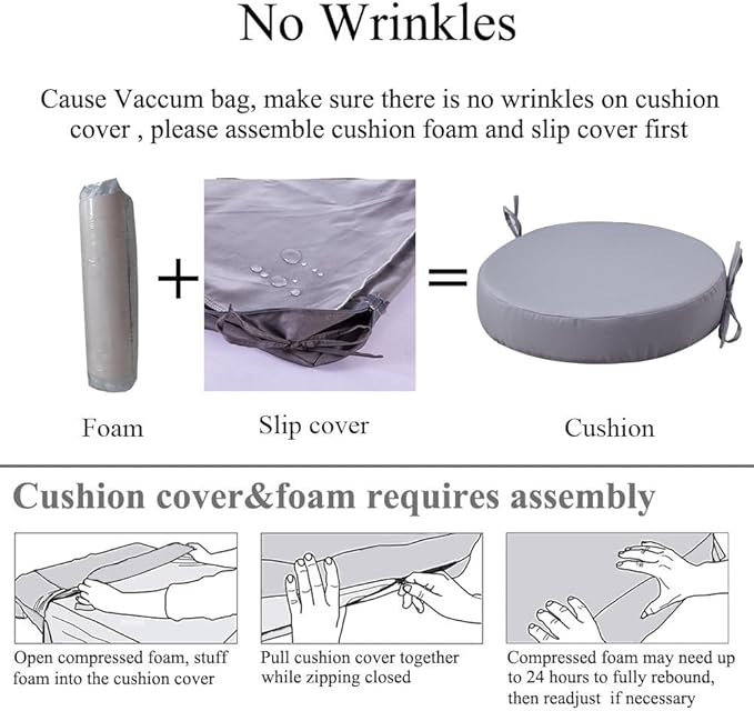 - 【Comfort & Support】 Experience ultimate comfort with the high density foam of these patio chair cushions set of 2. They provide excellent support for your hip, promoting good posture and allowing you to relax for extended periods of time. All outdoor dining chair cushions are packed with vacuum bag. You need to assemble cushion to make there is no wrinkles in cushion covers