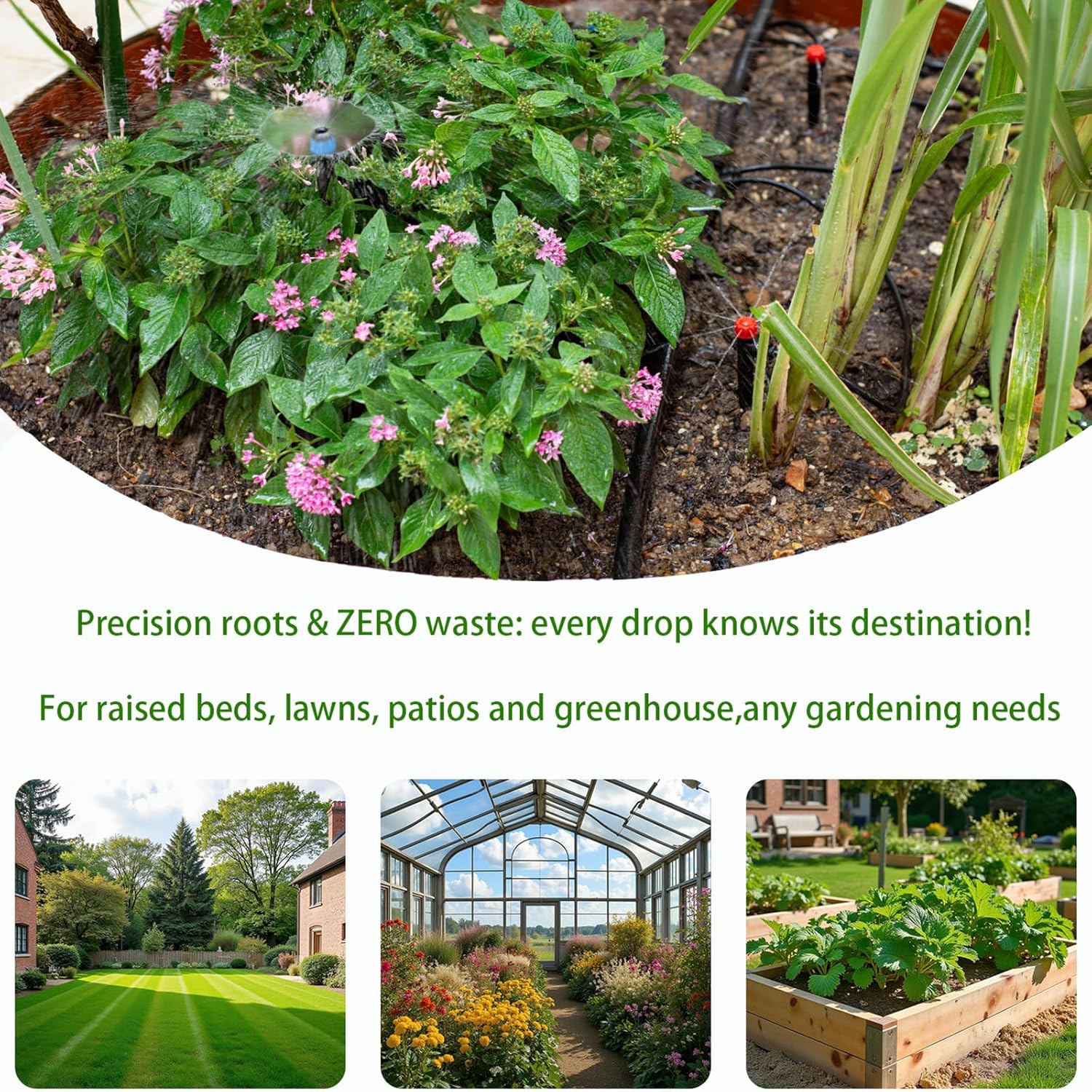 - Save Water and Time :This garden watering system for outdoor plants saves water and gardening time by eliminating manual watering. Precise root-targeted irrigation prevents plant rot from waterlogging while reducing evaporation and runoff. The adjustable drip emitters ensure uniform coverage for all plants.UV-resistant drip irrigation tubing guarantee year-round durability in harsh weather.Fewer Replacements, Lower Costs.