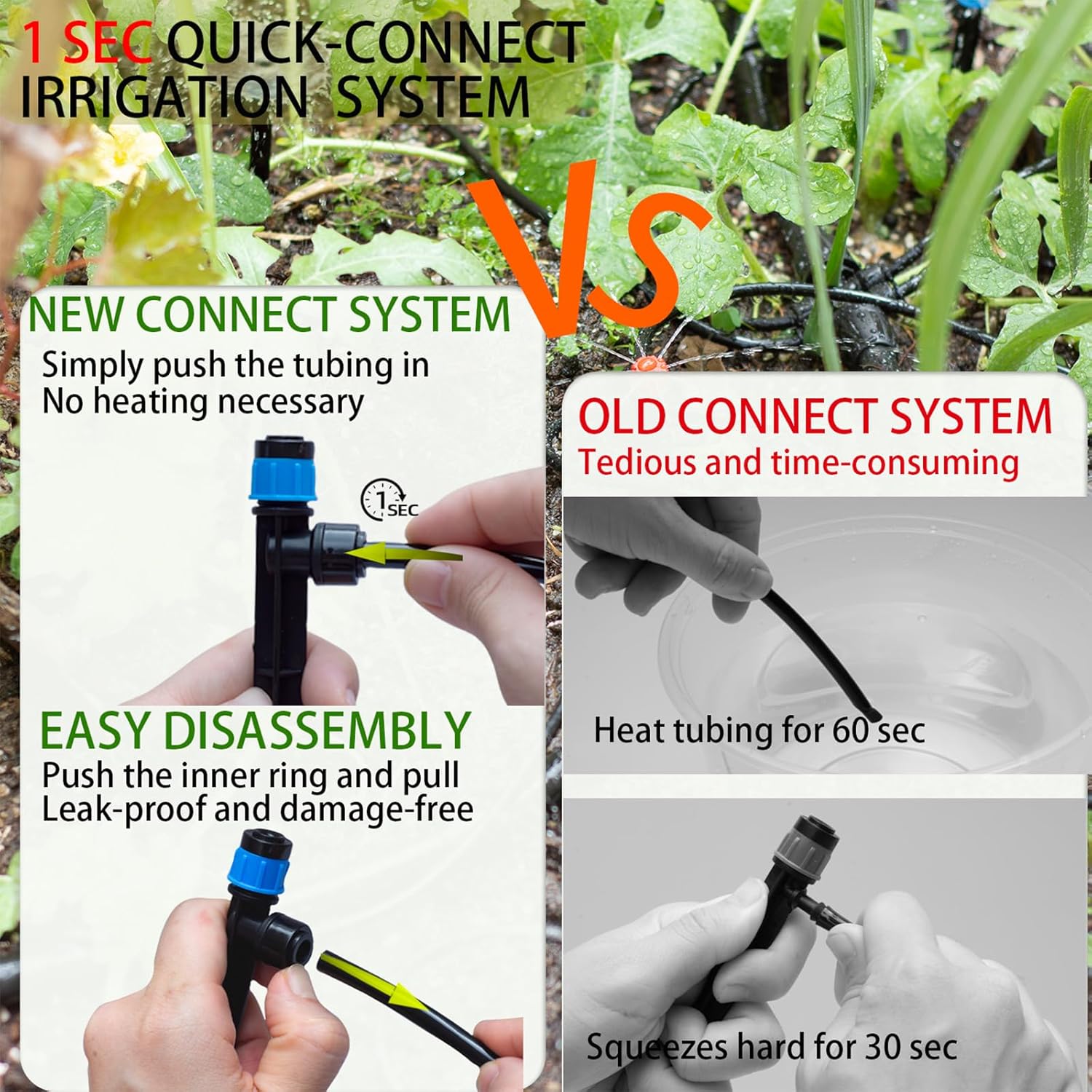 - Quick Connector Design Leak Proof Sprinkler Watering System:This plug-and-play irrigation tube features leak-proof, not easy to fall off , secure connections that install and operate this garden irrigation system within 10 minutes. Quick-release buttons at each connection point make disassembly and reassembly effortless. User manual with labled drip system parts making installation of this drip lines and sprays garden watering set quick, easy, and energy-saving