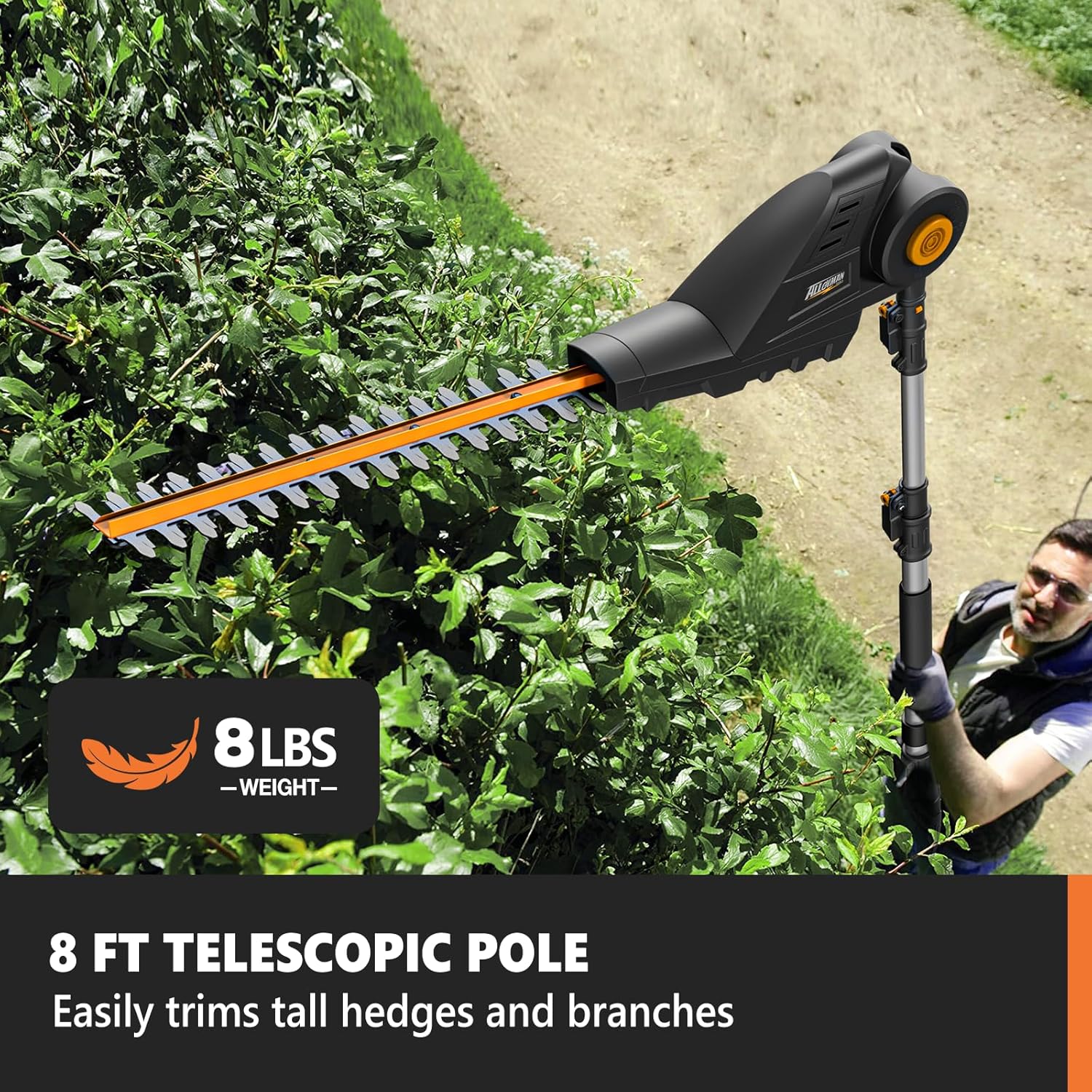 - 【2-IN-1 Pole Saw & Pole Hedge Trimmer】 2 IN 1 Pole Saw & Pole Hedge Trimmer with 8.6-inch saw head attachment and 16-inch hedge trimmer attachment is able to fully satisfy all your branch pruning needs.