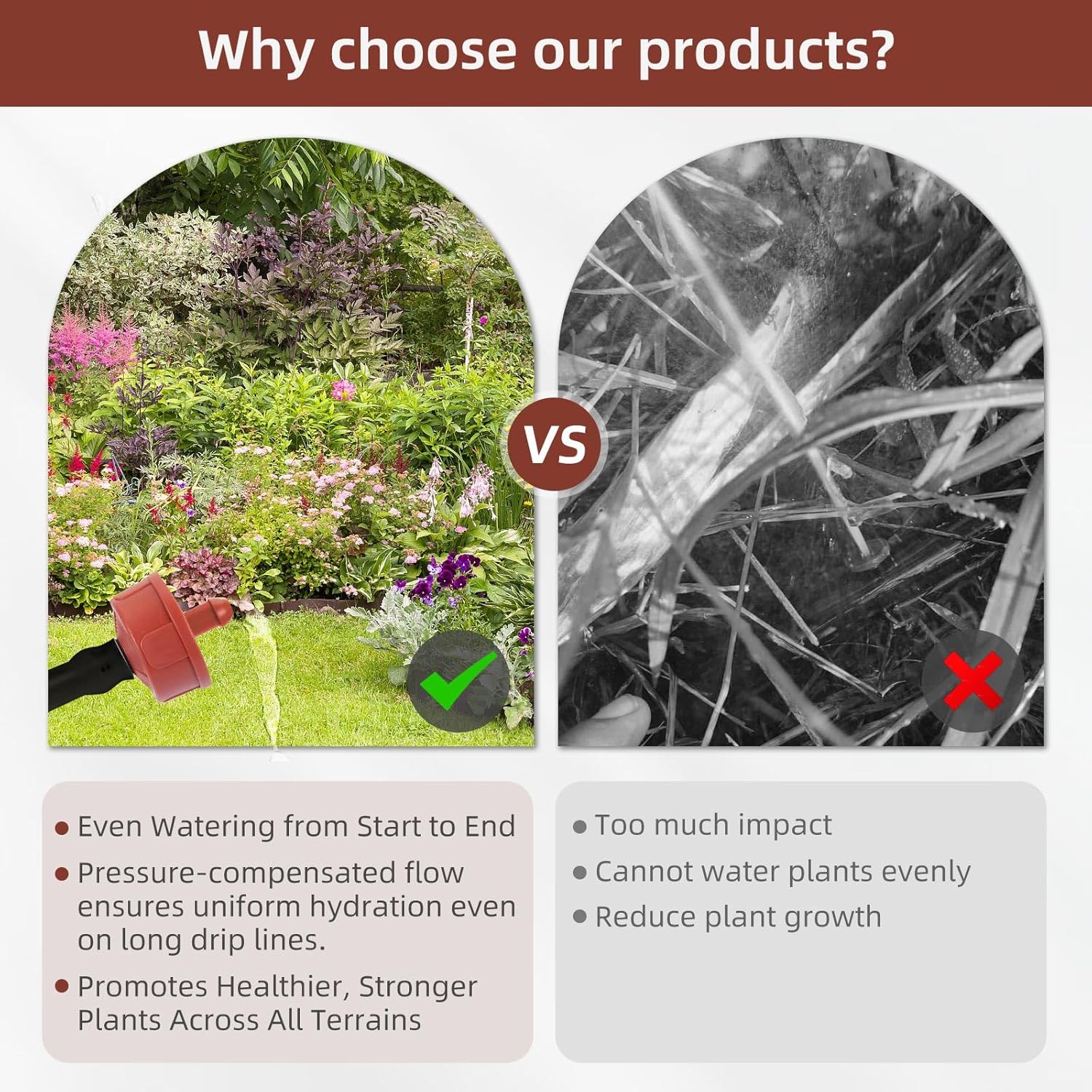 - Pressure Compensating Technology: Our pressure compensating irrigation spot drippers/emitters maintain a constant, steady 2 Gallon Per Hour(8L/H) water flow at 10-60 PSI. Whether on slopes, long lines, or uneven terrain, your plants will get the precise amount of water they need without the hassle of over- or under-watering.