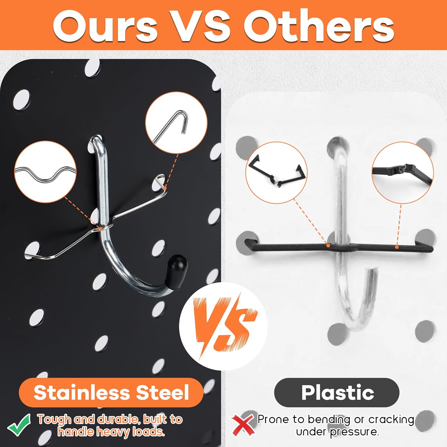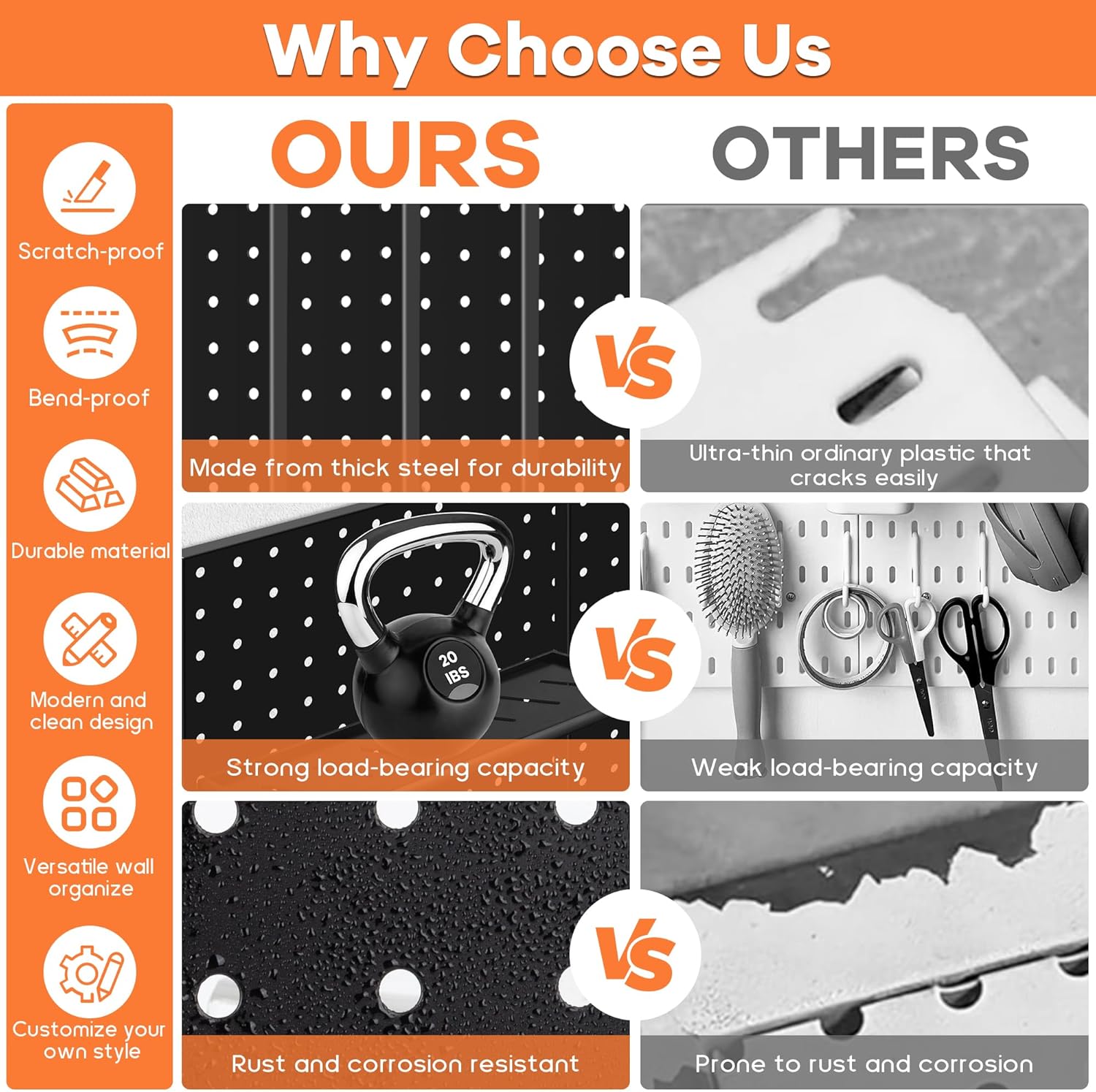 - 【Premium Materials】All-metal pegboard panels are crafted from top-grade heavy-duty steel, providing outstanding load-bearing capacity and durability. They are resistant to damage and wear, ensuring your tools organized and secure, and the pegboard panels without bending or warping for years to come. The pegboard comes with a scratch-resistant black galvanized surface finish that's easy to clean, providing extra protection against rust and corrosion