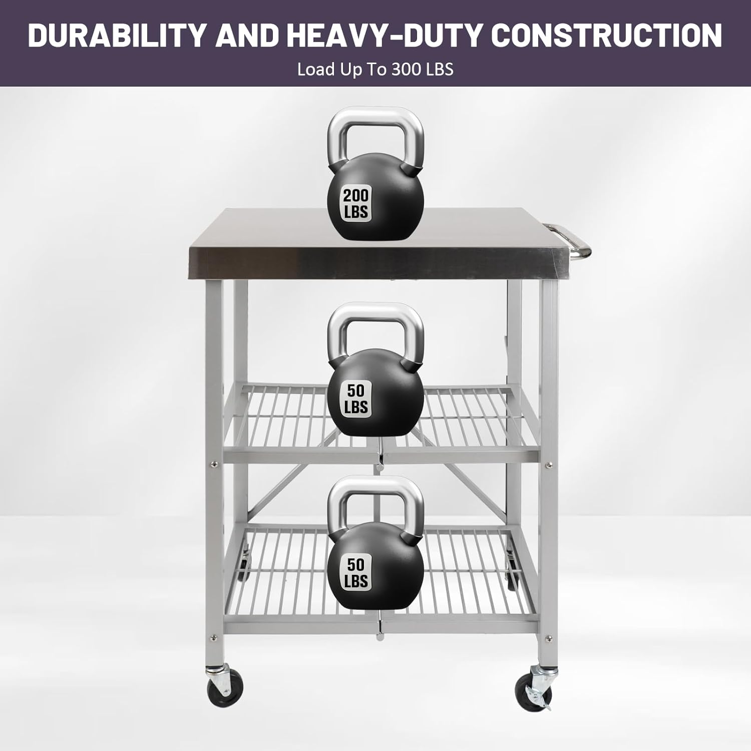 - 【Durability and Heavy-Duty Construction】: Built to last, our folding steel cart is made from heavy-duty, anti-rust, and corrosion-resistant stainless steel. The robust tabletop can support up to 100kg, while the two lower levels each support 25kg, allowing it to carry up to 300 lbs of heavy objects. Perfect for storing and transporting large kitchen appliances or heavy machinery, this rolling island for kitchen offers durability and safety for years to come.