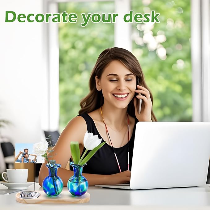 - Versatile Multi-Purpose Design:Crafted with thick hand-blown glass and natural wood combination to elevate your home's aesthetic,each vase is unique,the pigment is embedded in 2 layers of glass and won't fade and damage.Features additional jewelry tray and photo clip functions with exquisite design perfect for office desks,kitchens,windowsills,living rooms,and bedrooms