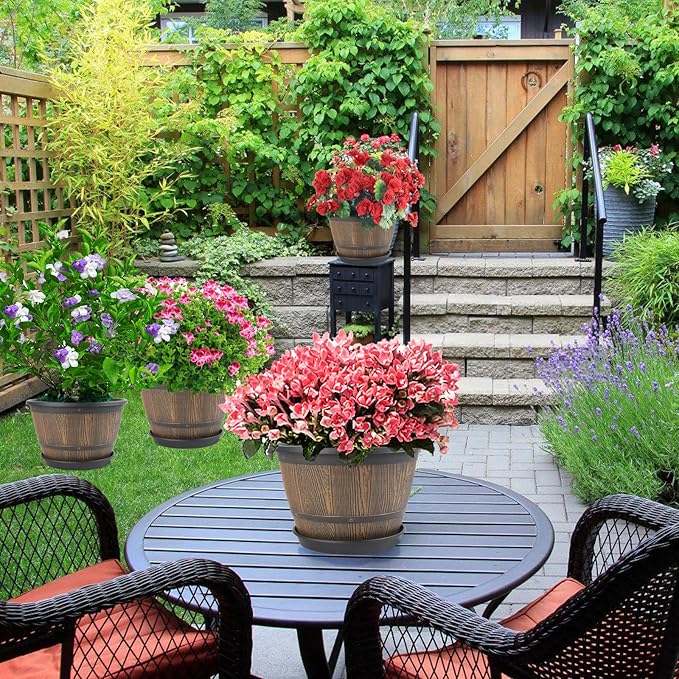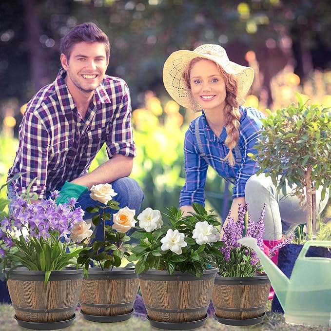 - 【Imitation Whiskey Barrel Design】These 10 inch planters for outdoor plants are designed with imitation wine barrel with rustic touch, which complements many different decorative styles. Planting with these plastic flower pots in your garden or front yard, not only make you feel peaceful rustic comfort, but also adds a touch of sophistication to indoor or outdoor spaces.