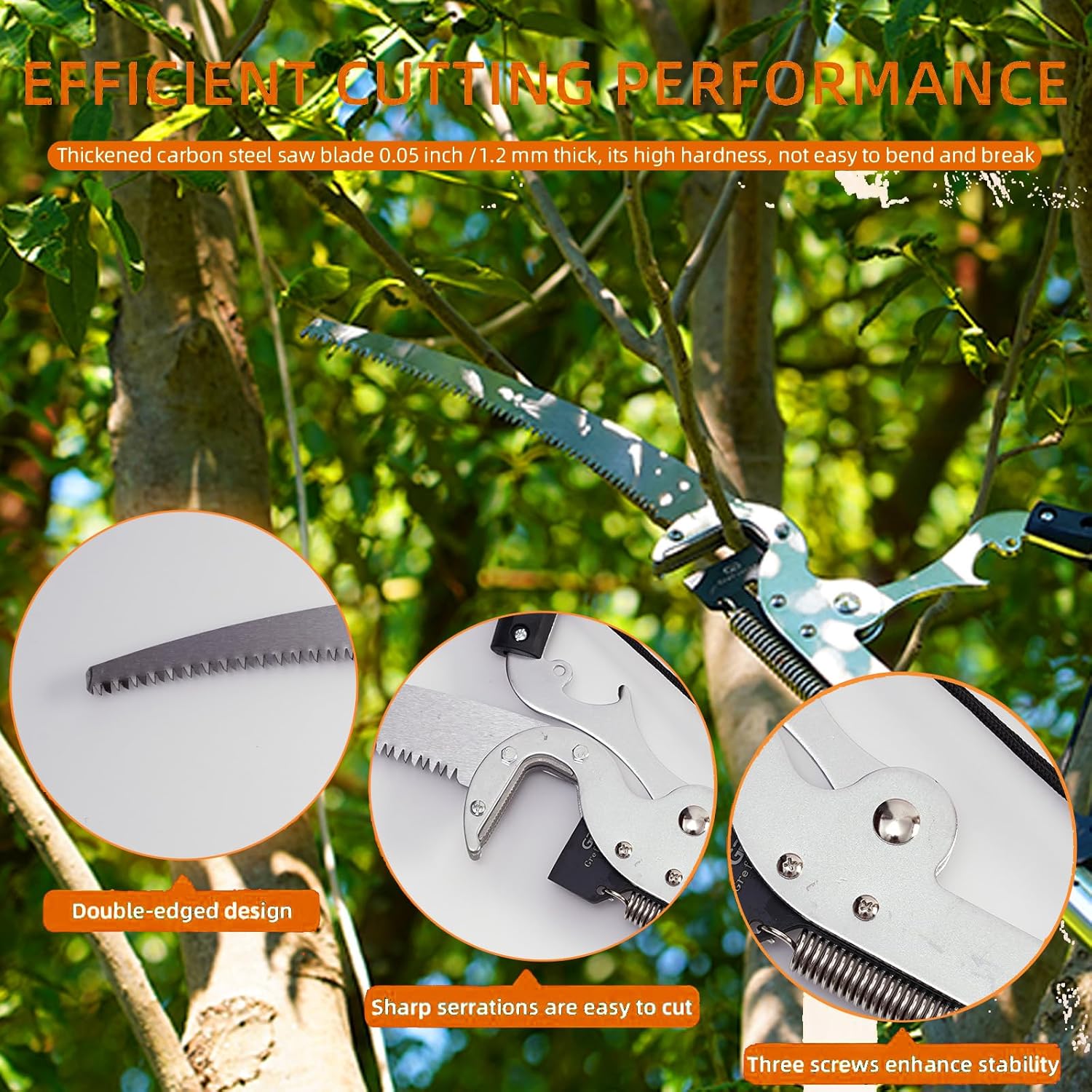 - Efficient Cutting Performance: Equipped with a thickened 0.05"/1.2mm carbon steel blade, our manual pole saw offers superior durability, resisting bending or breaking. The 108° curved saw blade, with dual-hook design at both ends and triple-ground teeth, ensures smooth, stable back-and-forth cutting action on thick branches. Includes two original saw blades for long-lasting use.