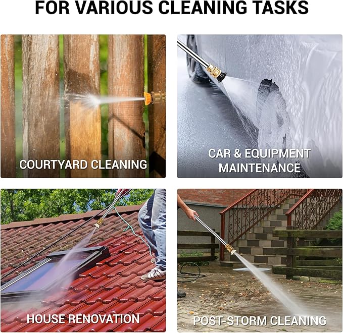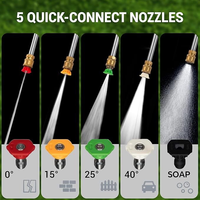 - [𝟓 𝐐𝐂 𝐍𝐨𝐳𝐳𝐥𝐞𝐬 𝐟𝐨𝐫 𝐀𝐥𝐥 𝐂𝐥𝐞𝐚𝐧𝐮𝐩 𝐍𝐞𝐞𝐝𝐬 – 𝐟𝐫𝐨𝐦 𝐃𝐚𝐢𝐥𝐲 𝐇𝐨𝐮𝐬𝐞 𝐂𝐥𝐞𝐚𝐧𝐮𝐩 𝐭𝐨 𝐋𝐚𝐫𝐠𝐞 𝐄𝐪𝐮𝐢𝐩𝐦𝐞𝐧𝐭 𝐌𝐚𝐢𝐧𝐭𝐞𝐧𝐚𝐧𝐜𝐞] Easily switch between 5 quick-connect nozzles (0°, 15°, 25°, 40°, and soap). From high-pressure jets (0°) for deep stains to gentle 40° spray for delicate surfaces—the washer easily covers every cleaning need for gutters, driveways, home exteriors, decks, fences, furniture, cars/RV, boats, or mechanical equipment maintenance.